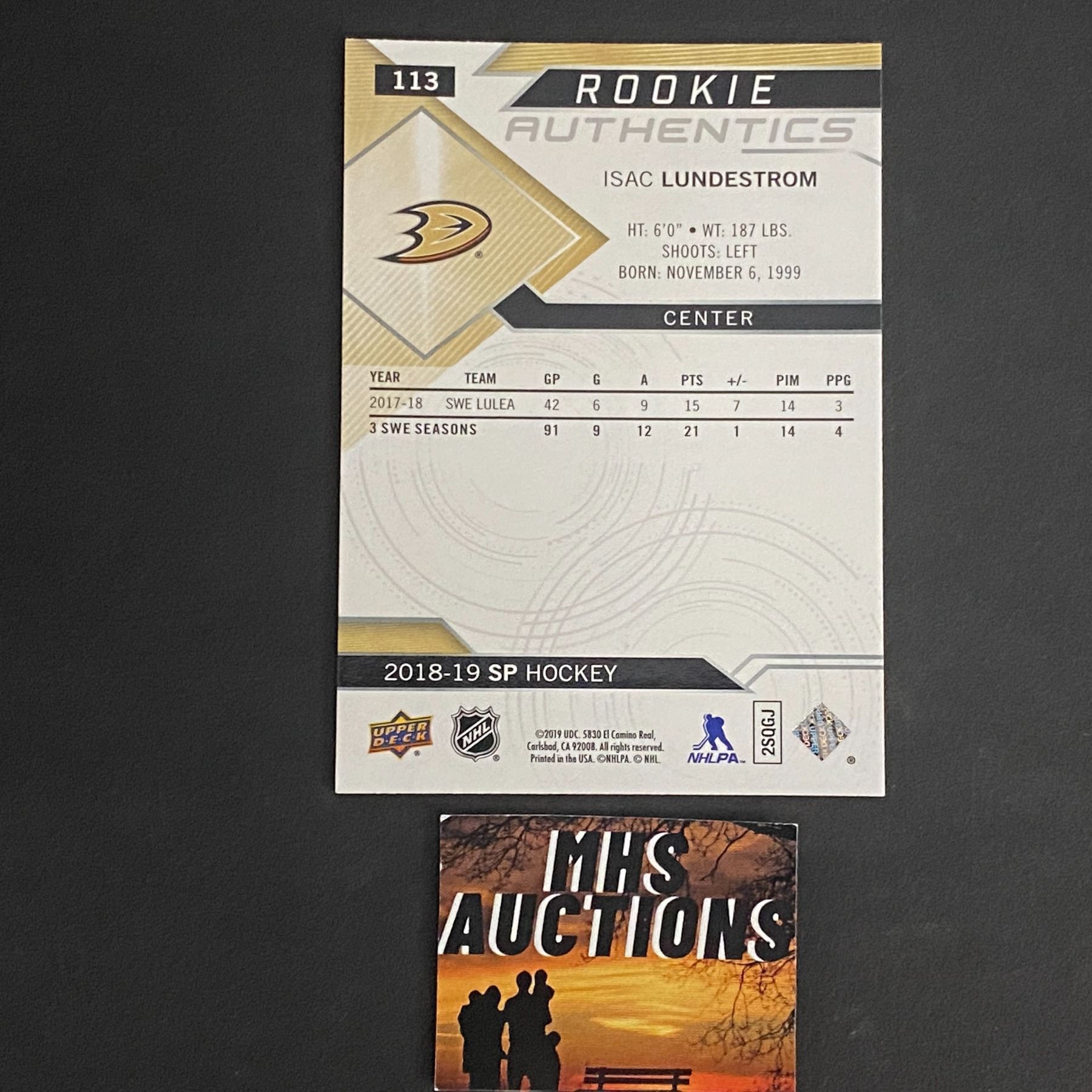 2018-19 SP HOCKEY ROOKIE CARD ISAC LUNDESTROM