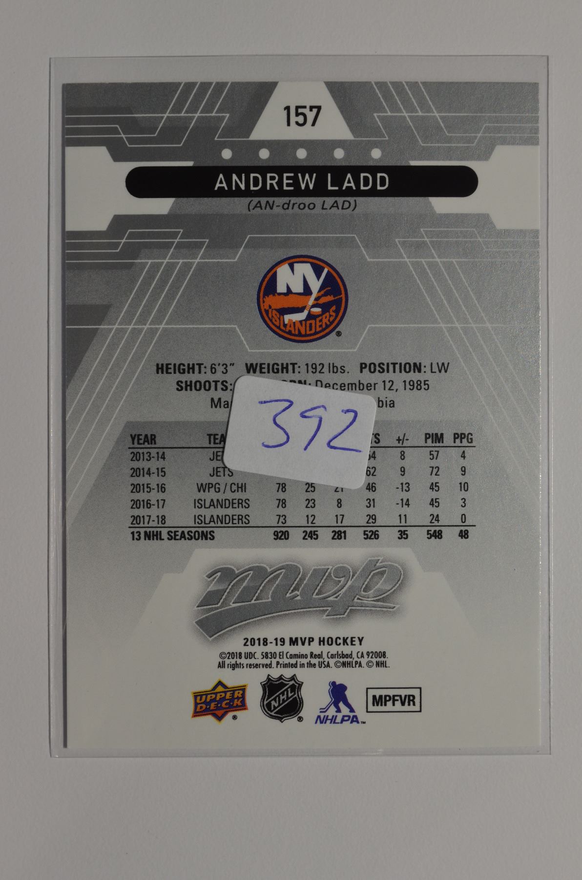 2018-19 Upper Deck MVP Silver Script #157 Andrew Ladd