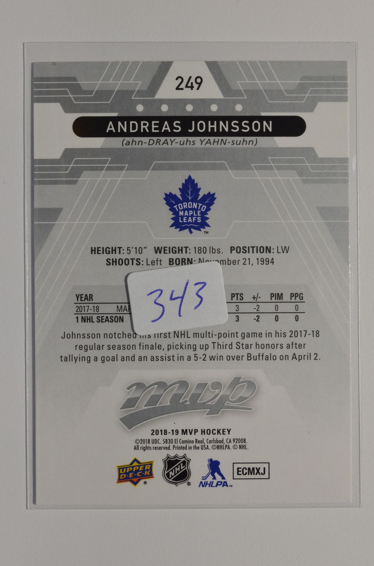 2018-19 Upper Deck MVP Silver Script #249 Andreas Johnsson