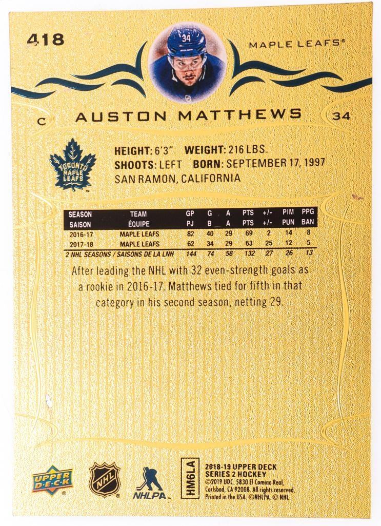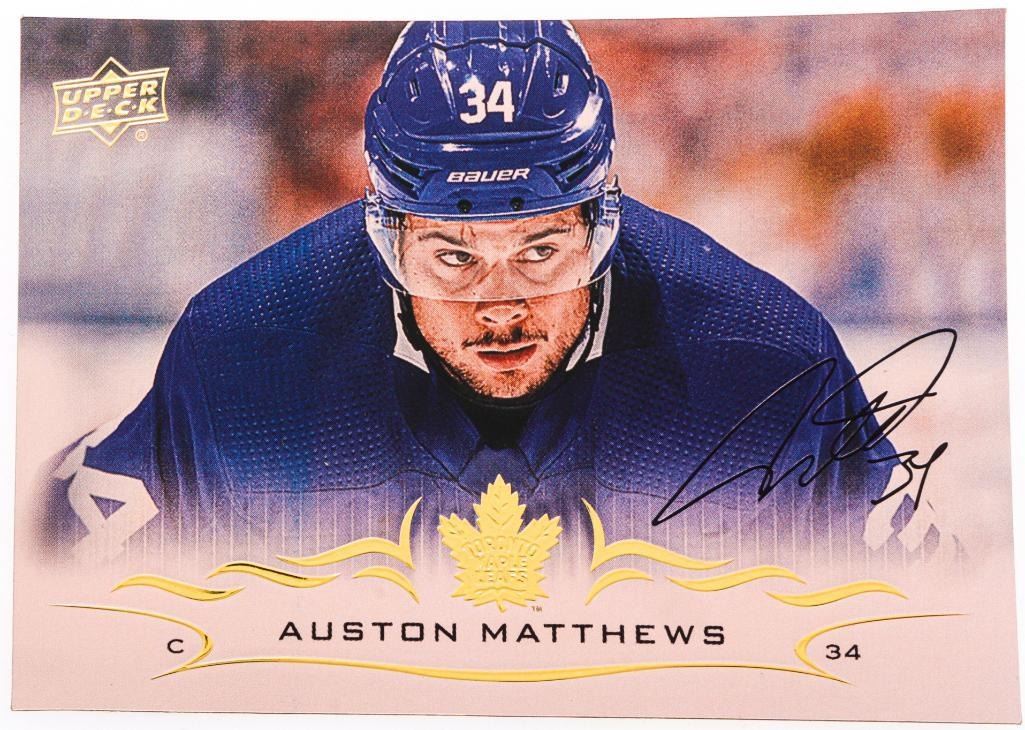 2018-19 Upper Deck Series 2 - Card #418 AUSTON MATTHEWS,23kt Gold Overlay. Plate Signature