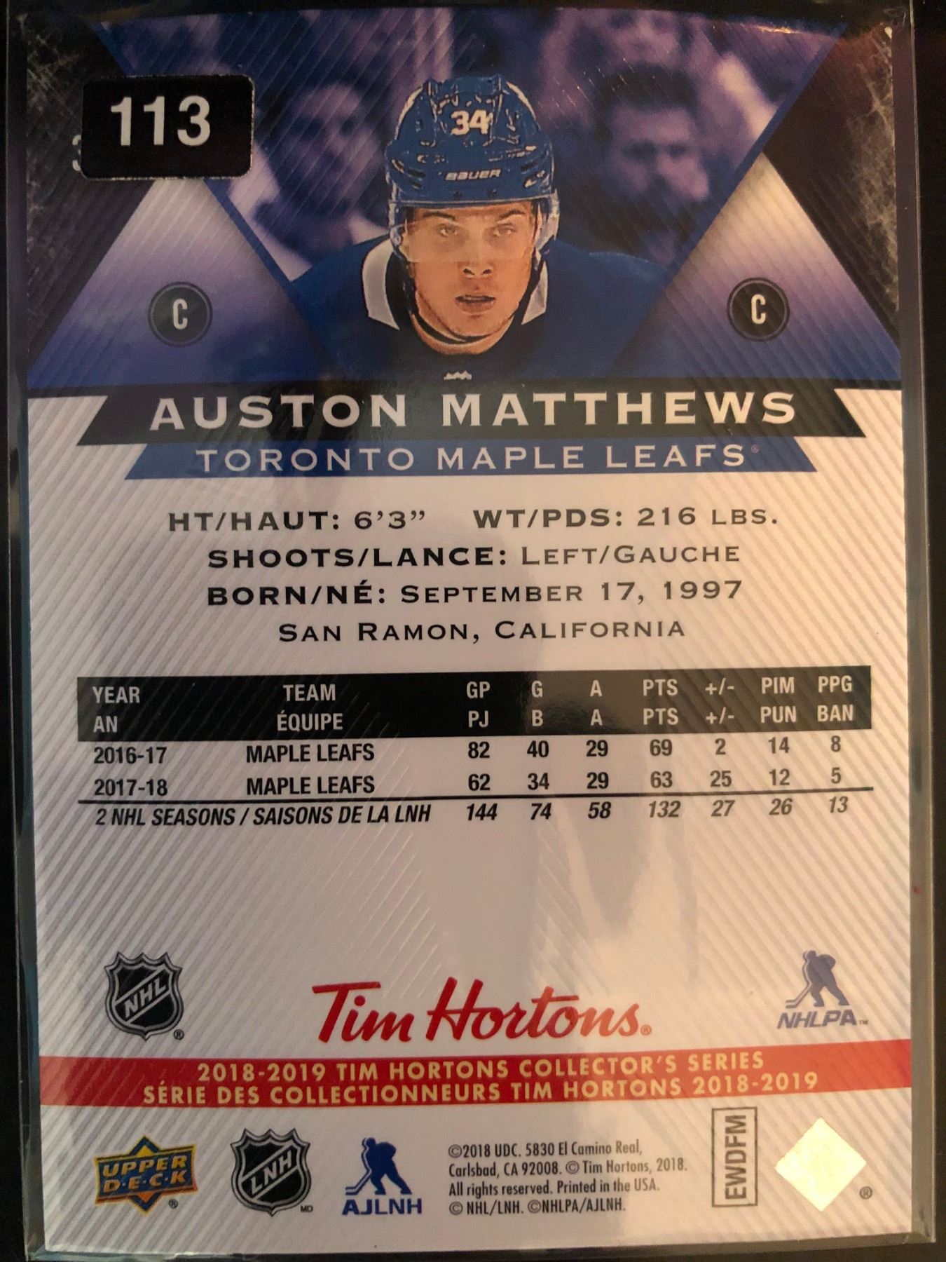 2018-19 Upper Deck Tim Horton's Auston Matthews #34