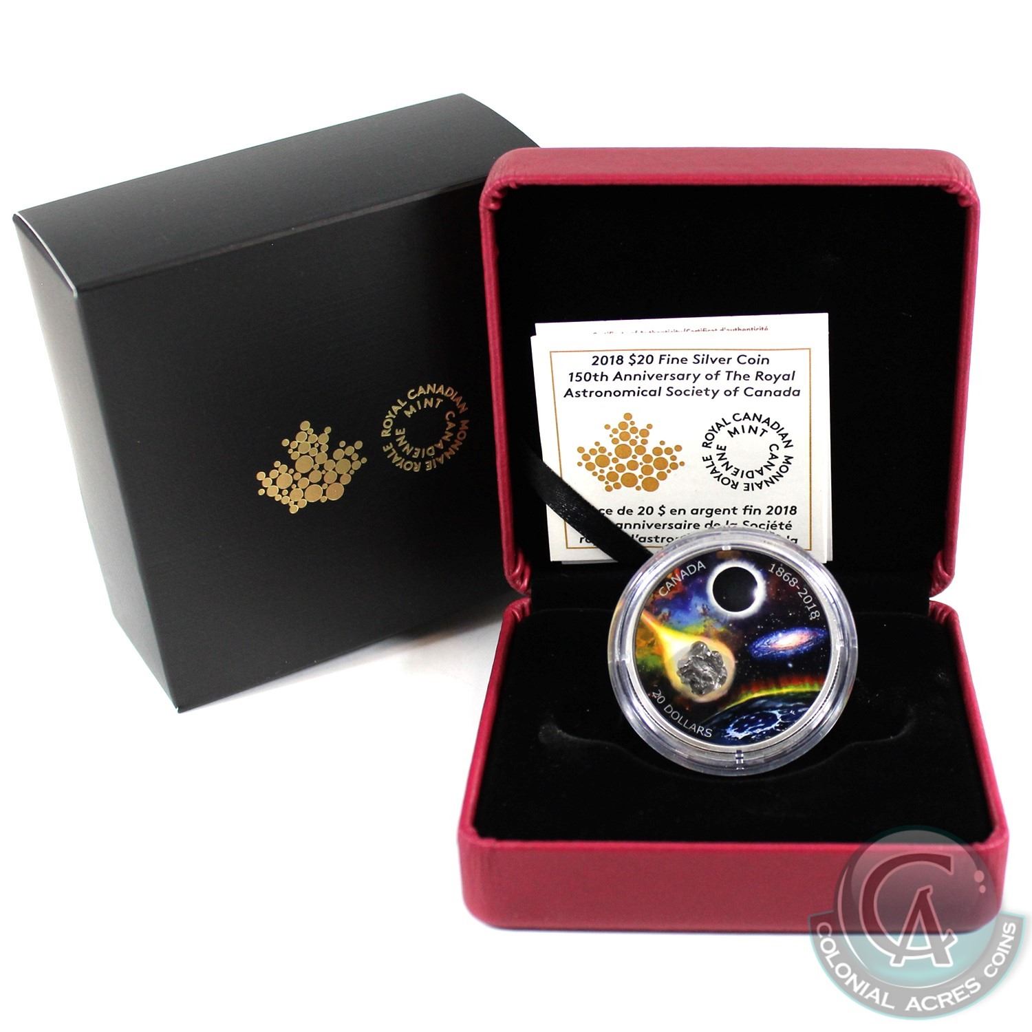 2018 $20 150th Anniversary of the Royal Astronomical Society of Canada Meteorite Fine Silver Coin (capsule lightly scratched). Tax Exempt