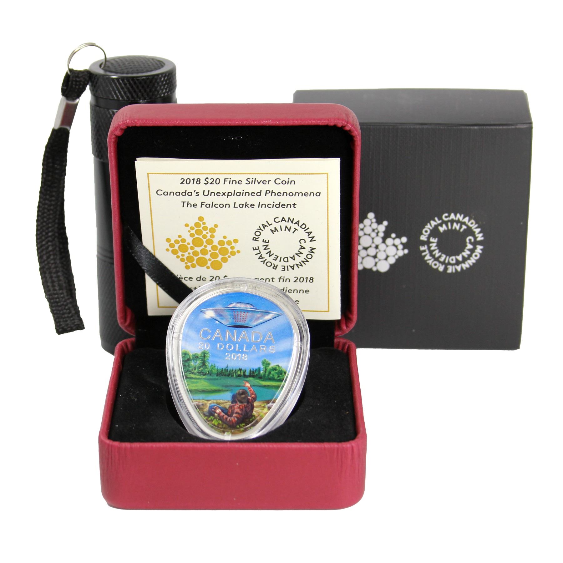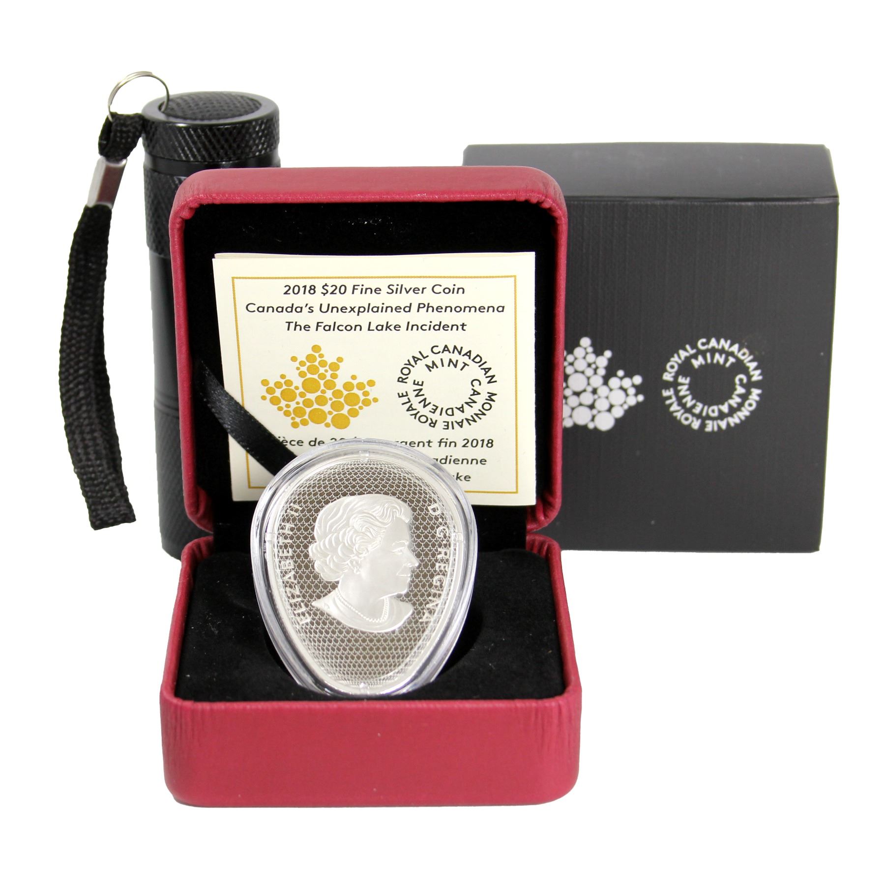 2018 $20 Canada's Unexplained Phenomena - The Falcon Lake Incident, Fine Silver With Selective Blacklight Colour. First in this Popular Series with a Mintage of Only 4000! Includes blacklight! (Tax Exempt)