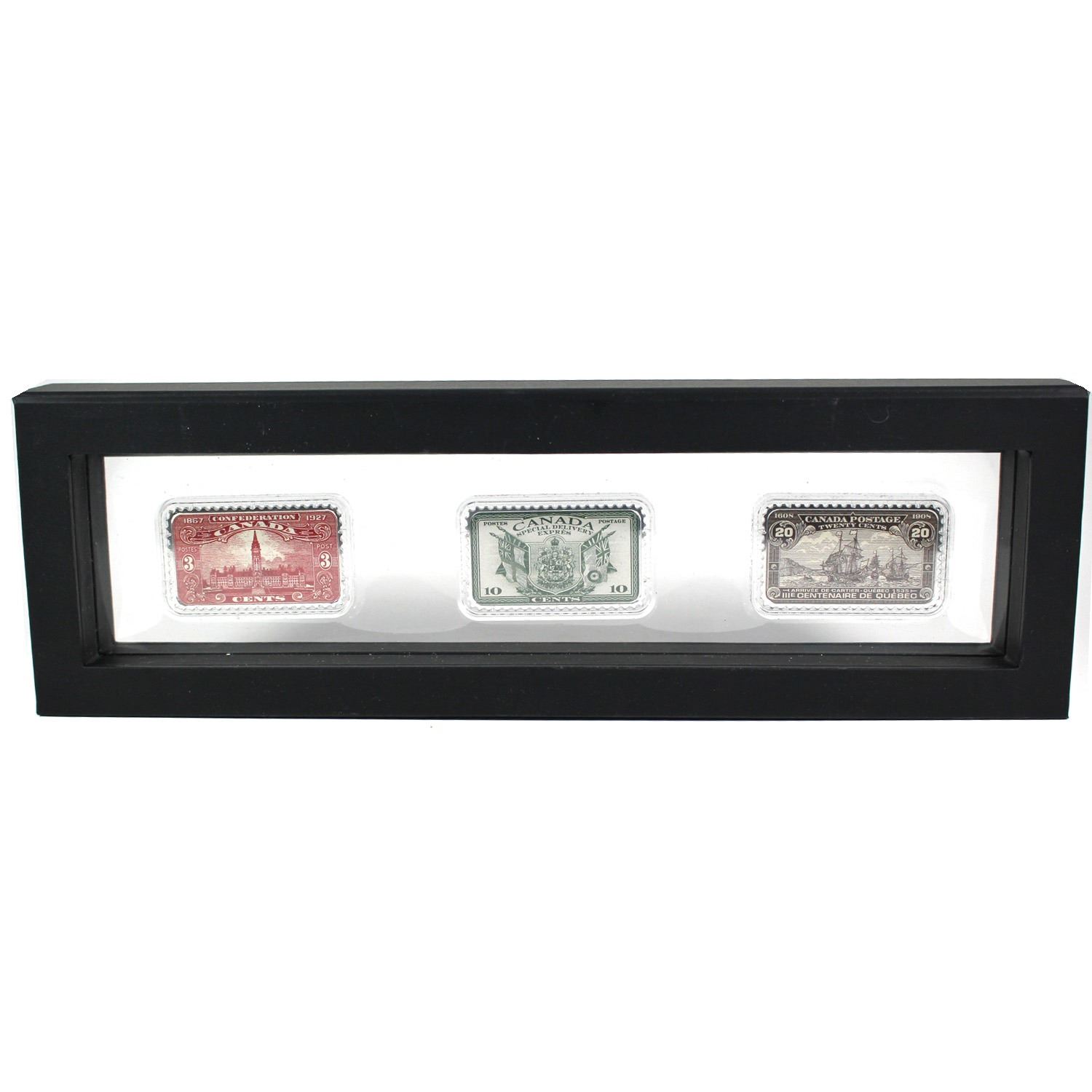 2018-2019 $20 Canada's Historical Stamps Fine Silver Coloured Coins in Magic Window Frame. You will receive 2018 Parliament Building 1927 Confederation, Arrival of Cartier - Quebec 1535 & Coat of Arms and Flags Special Delivery. (TAX Exempt)