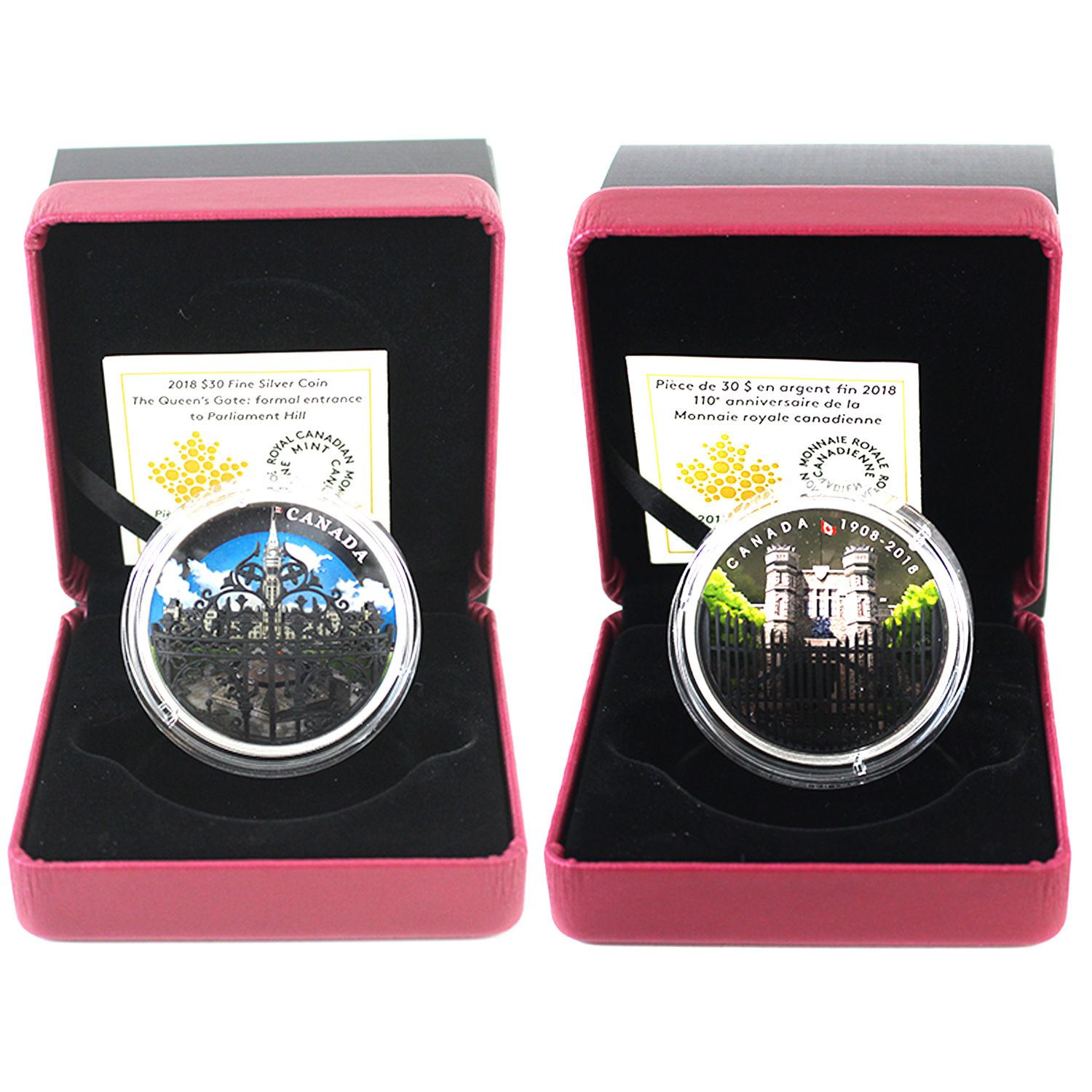 INCLUDES: The Queen's Gate - Formal Entrance to Parliament Hill (2oz Silver) & 110th Anniversary of the Royal Canadian Mint (2oz Silver) Coins are .9999 Silver with Selective Colour. Some scratching and toning. Minor scuffing on capsules; boxes may show some wear.2pcs.