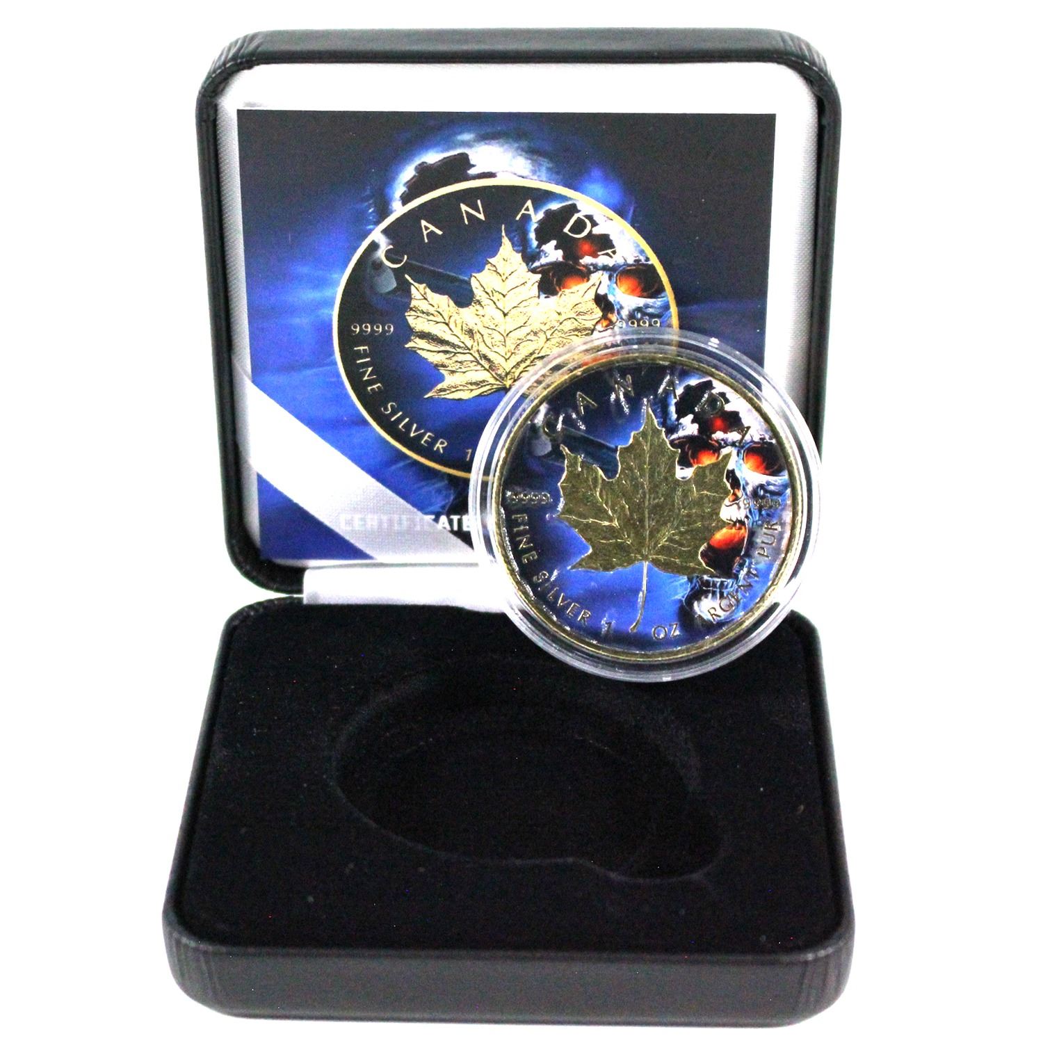 2018 $5 1oz Silver Maple leaf with Special effects. Coin has been selective gold plated with Gold plated with Colourized background of Skeleton. Comes encapsulated and with box & C.O.A. #055/500 (Tax exempt)