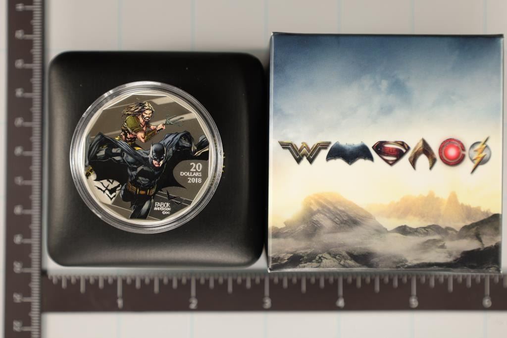AQUAMAN $20 COIN, PROOF QUALITY, 31.83 GRAMS, WITH A SPECIAL APPLICATION WHICH GIVES BATMAN'S SUIT A LEATHER LIKE FINISH AND AQUAMAN A GLISTENING FINISH, IN ORIGINAL ROYAL CANADIAN MINT PACKAGING WITH