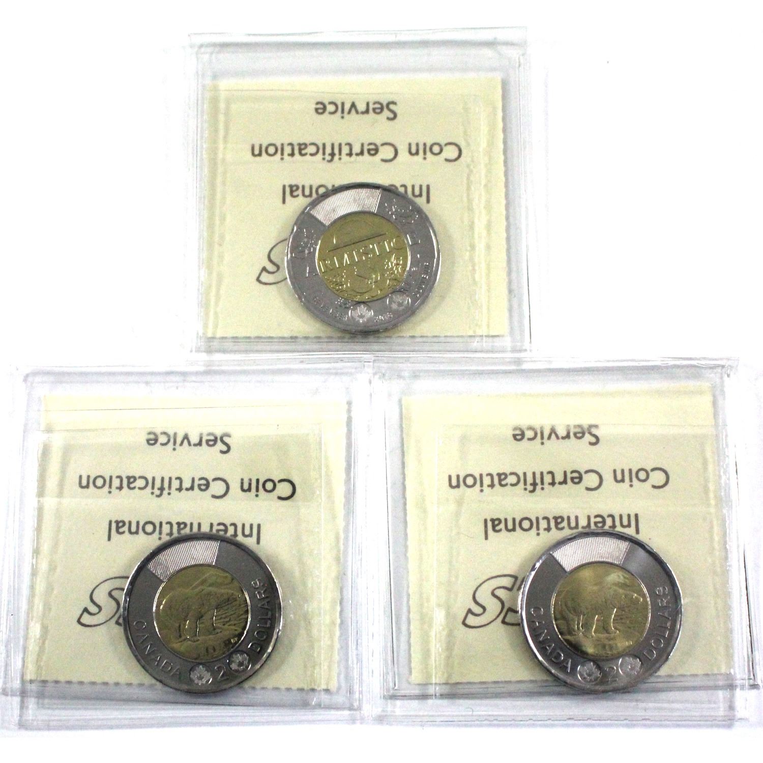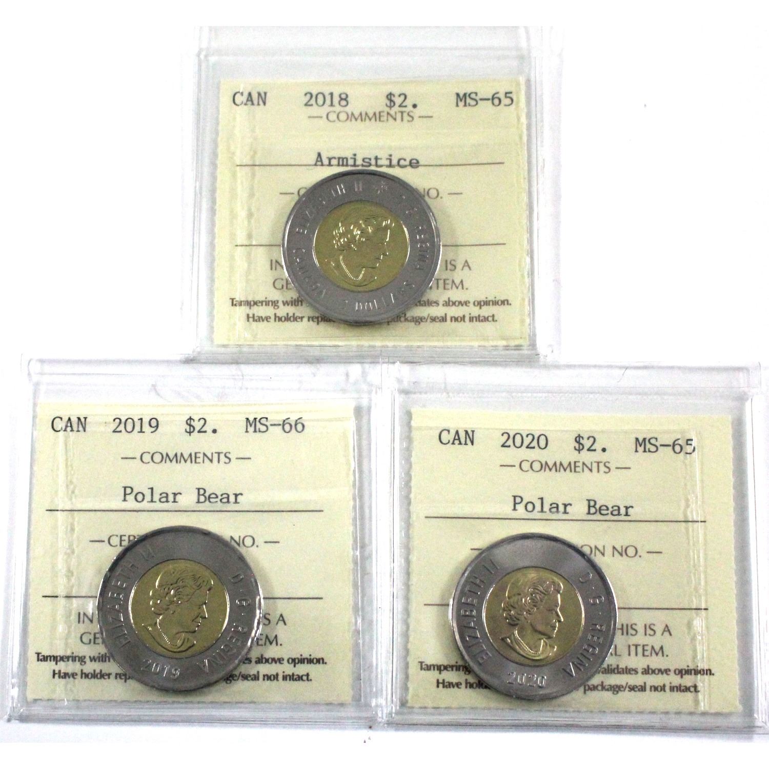 2018 Canada $2 Armistice ICCS Certified MS-65, 2019 $2 MS-66 & 2020 $2 MS-65. 3pcs
