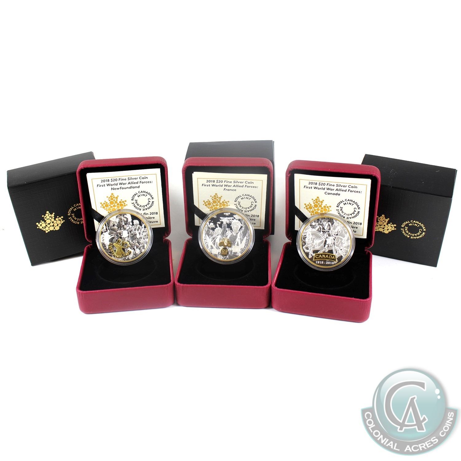 2018 Canada $20 First World War Allied Forces Fine Silver Coins - France, Newfoundland & Canada. 3pcs (TAX Exempt)