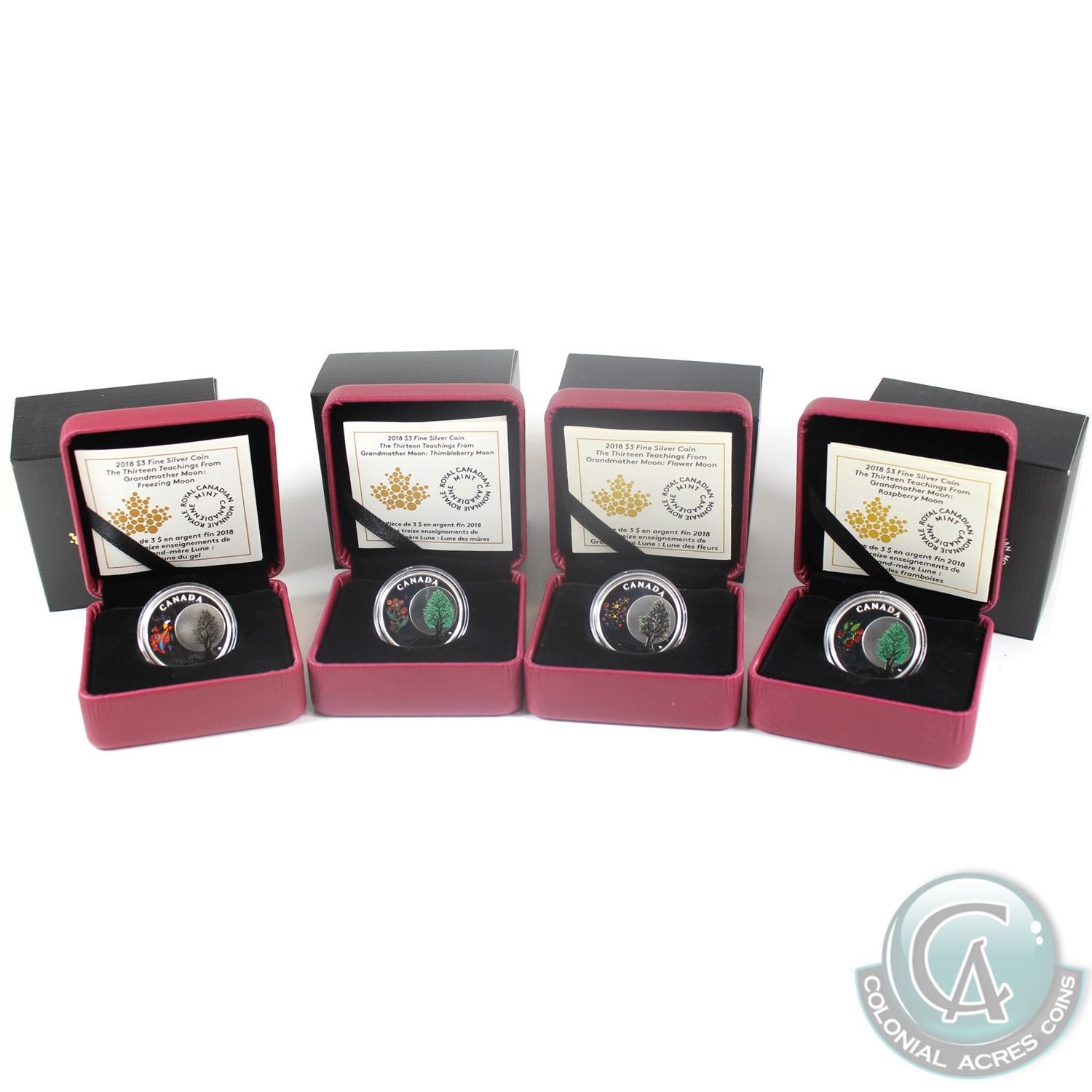 2018 Canada $3 The Thirteen Teachings from Grandmother Moon Fine Silver Coins - Raspberry Moon, Thimbleberry Moon, Flower Moon & Freezing Moon. 4pcs (TAX Exempt)