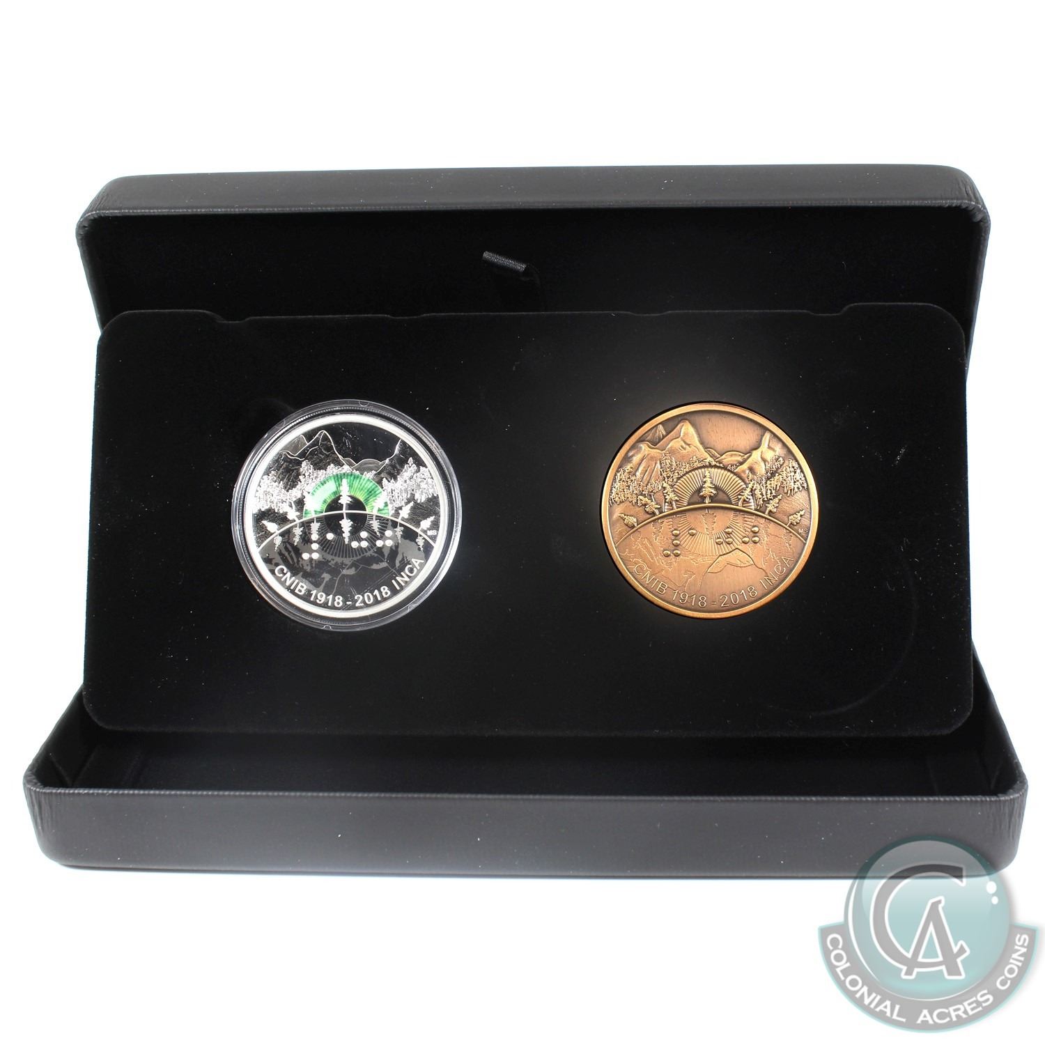2018 Canada $30 CNIB 2-coin Set (Silver Coin & Bronze Medallion) Tax Exempt. Note scratches on capsule.