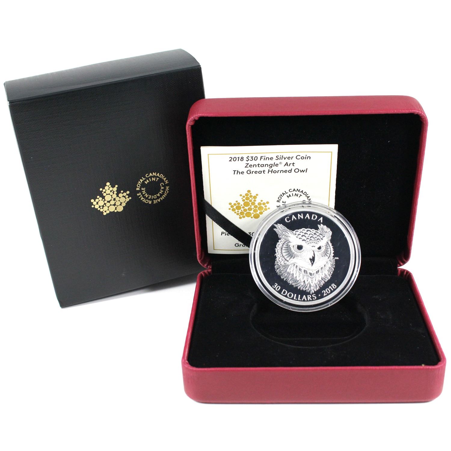 2018 Canada $30 Zentangle Art - The Great Horned Owl Fine Silver Coin (Capsule lightly scuffed). TAX Exempt