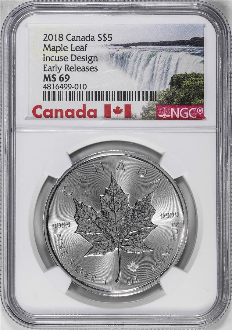 One 2018 Canada $5 Maple Leaf Incuse Design Silver Coin NGC MS69 Early Releases. NGC Certified.