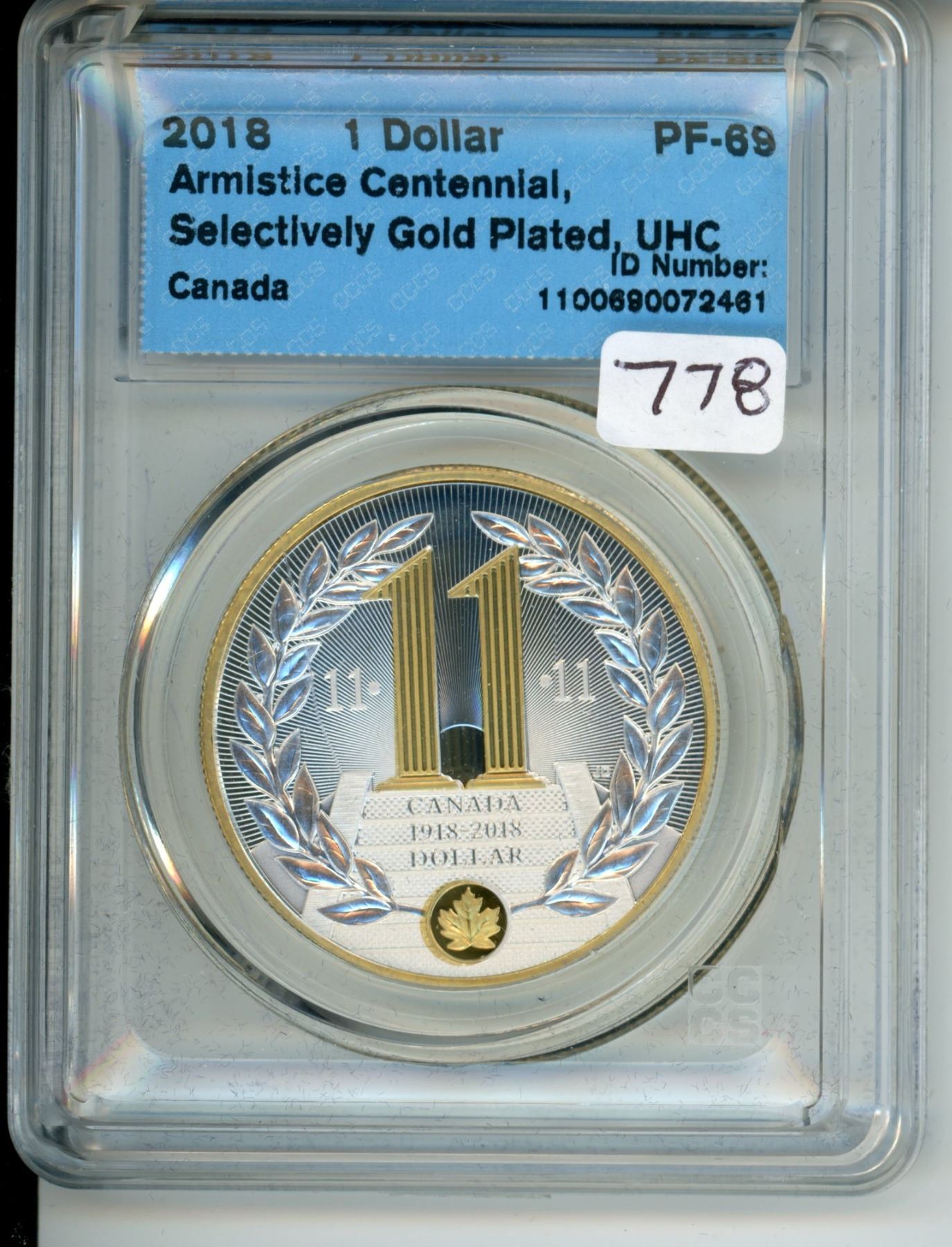 2018 Canadian $1 Armistice Centennial, Selectively Gold Plated, UHC - PF-69 - CCCS Graded