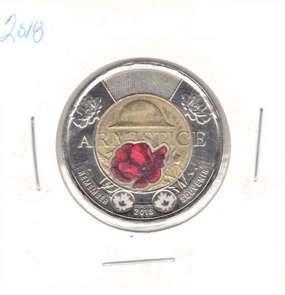 2018 Canadian Two Dollar Coin - Armistrice 100th Coloured Poppy. This is another of the Toonies remembering a significant passage in the World this is the coloured version of the coin shown 2,000,000 very rare and hard to obtain due to the very limited number minted