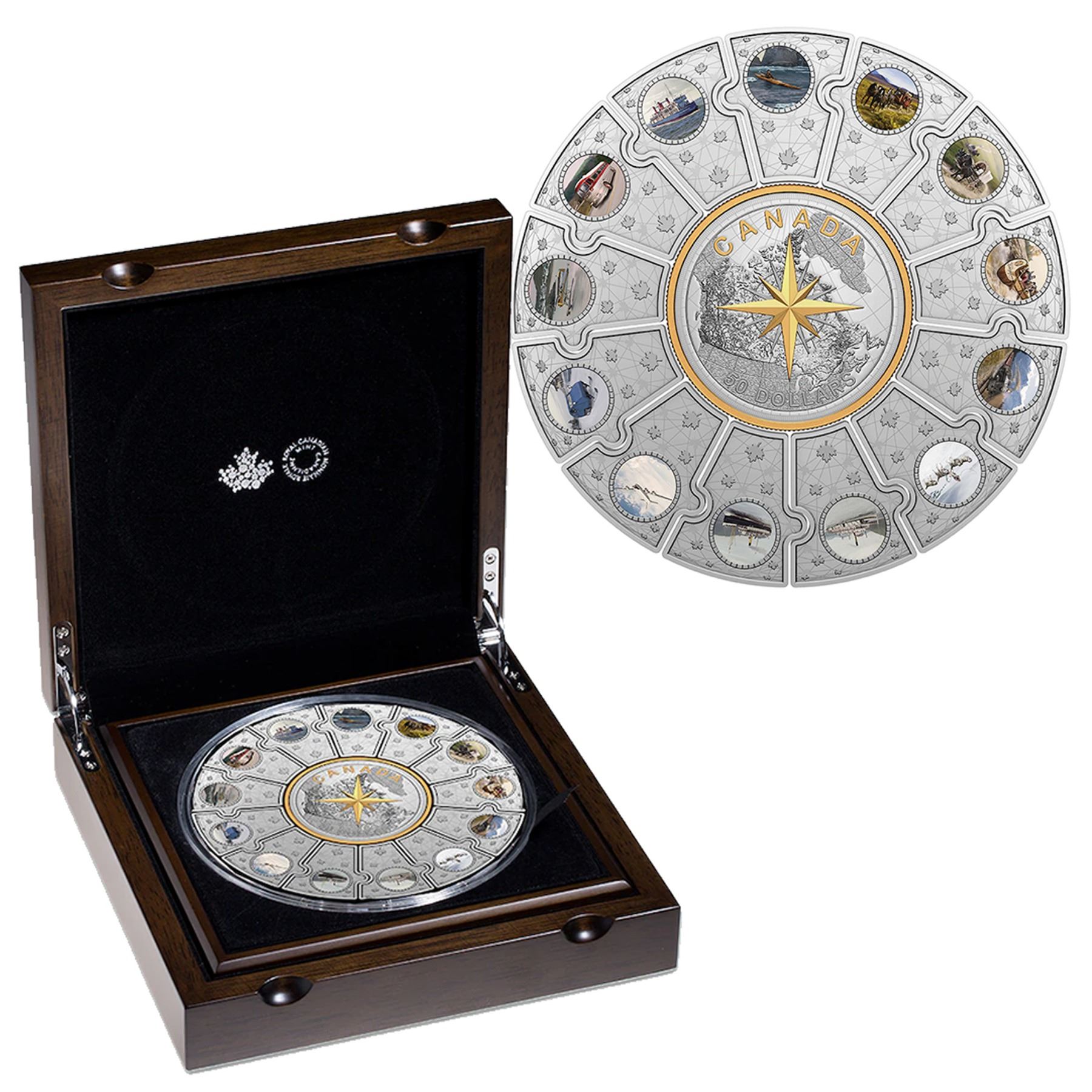 2018 Connecting Canadian History 14-Piece Fine Silver Puzzle Coin Set with Selective Gold-Plating. Comprised of $20 Puzzle Pieces and $50 Coin in Centre. Low Mintage of only 800! (Tax Exempt)