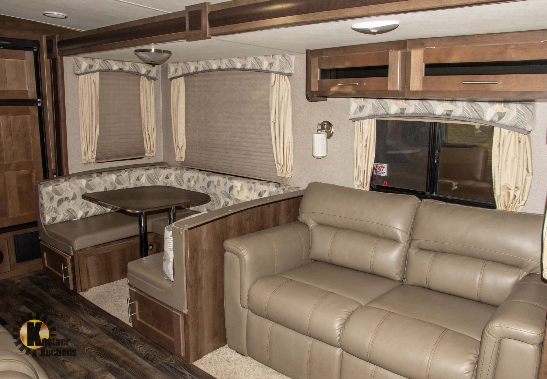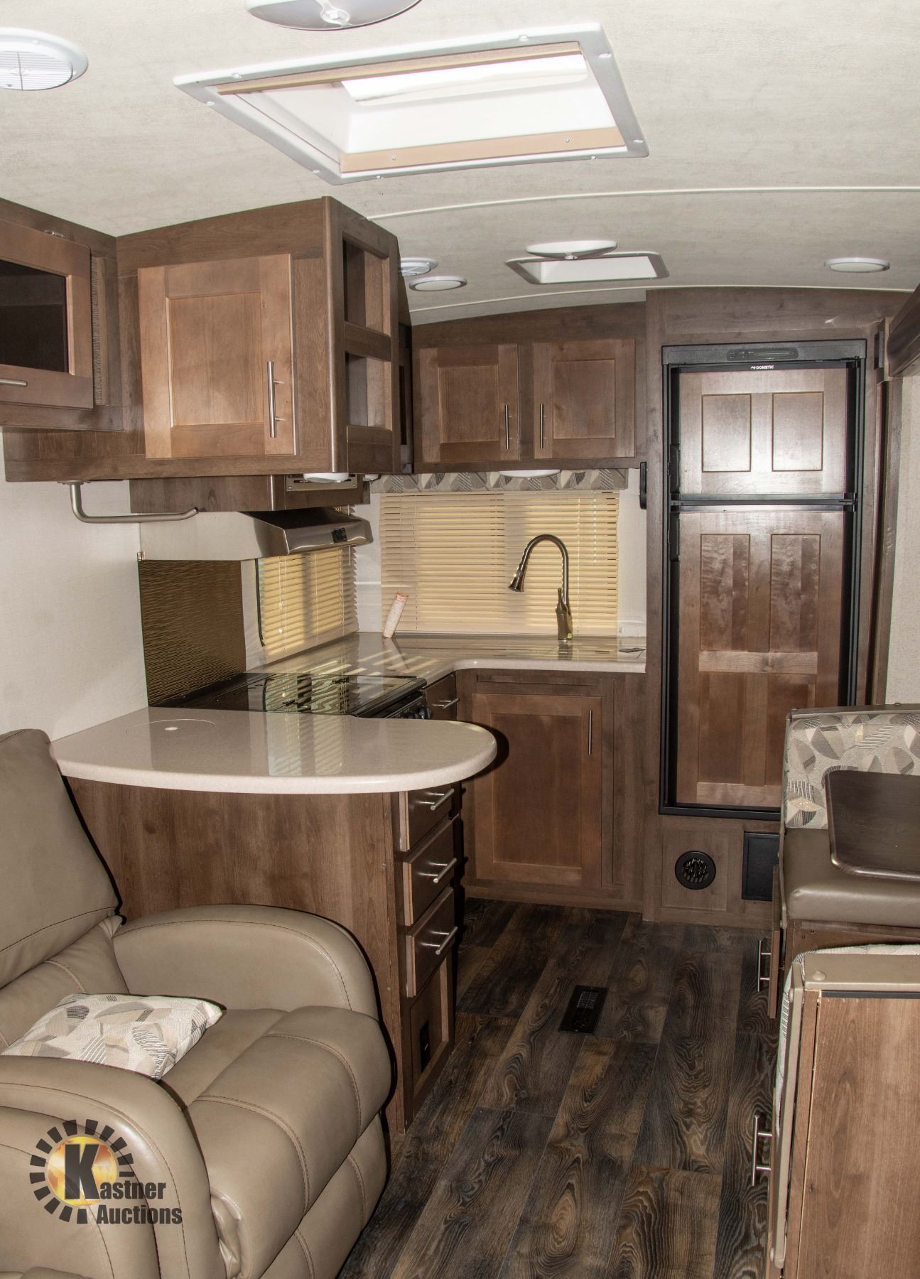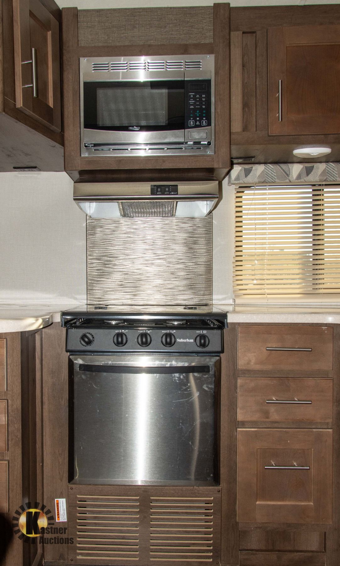 HOLIDAY TRAILER FEATURES STONE COUNTERTOPS, 3 BURNER SUBURBAN STOVE, HIGHPOINT STAINLESS STEEL MICROWAVE, WOOD PANELLED FRIDGE/FREEZER, 2 LEATHERETTE RECLINERS, LEATHERETTE PULL OUT COUCH, 40" HAIER FLAT SCREEN TV, FULL SHOWER TOILET AND SINK IN BATHROOM, DOUBLE SIZE BED IN BEDROOM. POWER AWNING, 2 SLIDES. WIRED FOR SOLAR, 1/2 TON SERIES.