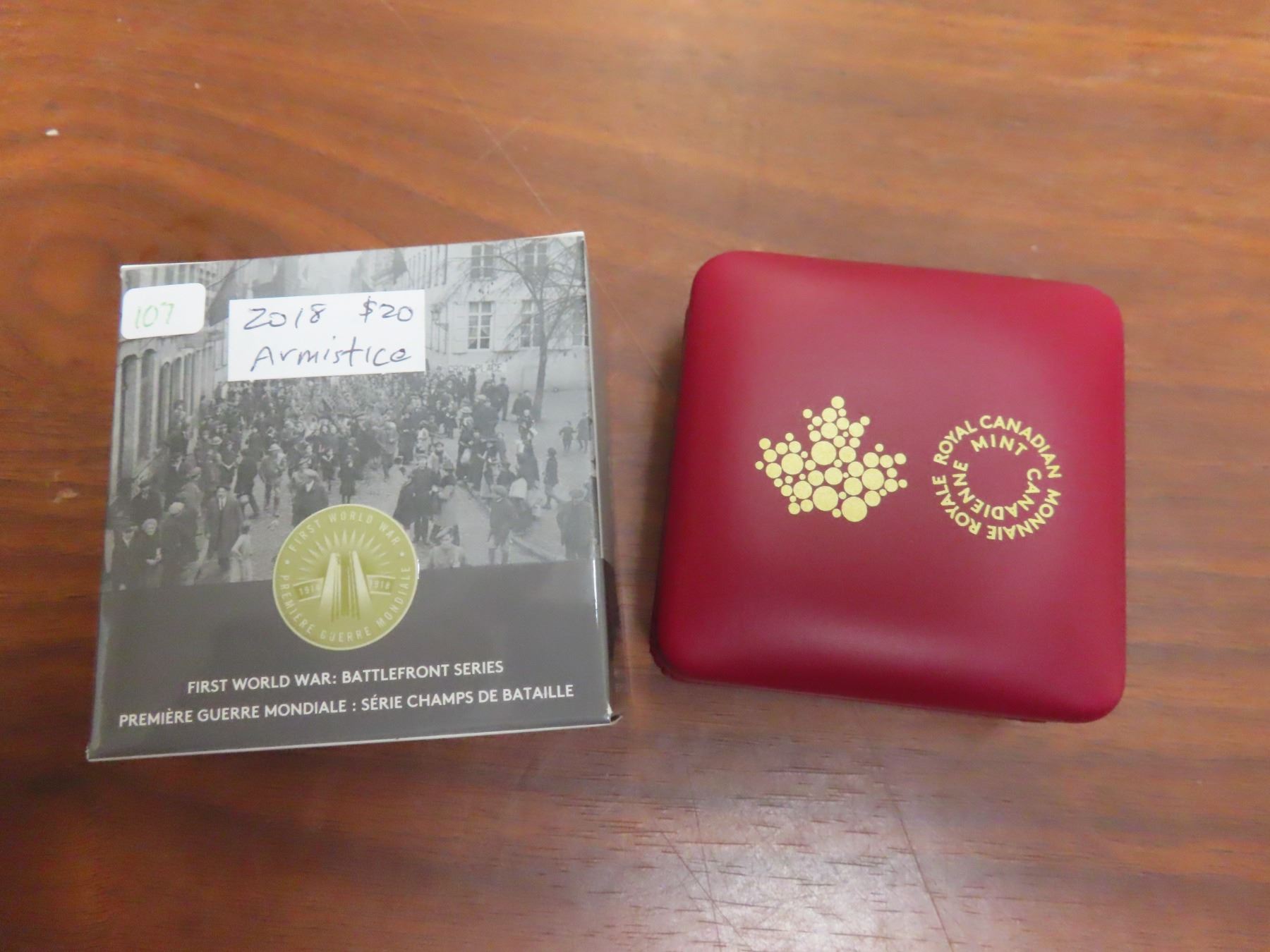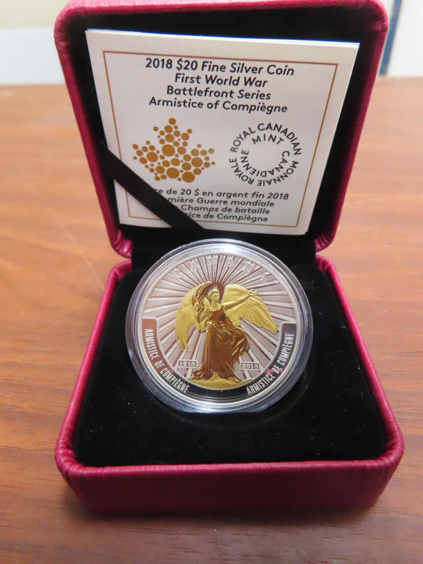 2018 First World War Battlefront Series: Armistice of Compiegne $20. 99.99% pure Silver with gold plating on Victory. Proof with Ultra Heavy Cameo. Housed in its original Royal Canadian Mint case & box of issue. Includes Certificate of Authenticity.