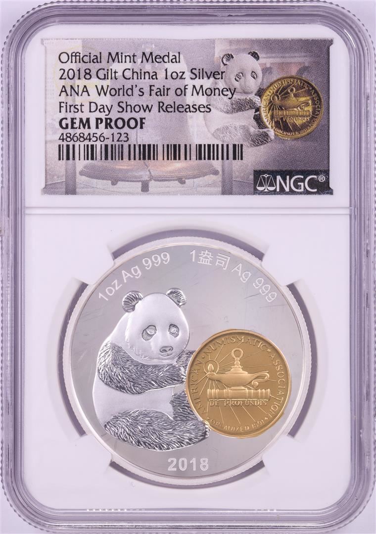One 2018 Gilt China Panda Philadelphia ANA World's Fair NGC Gem Proof First Day. NGC Certified.