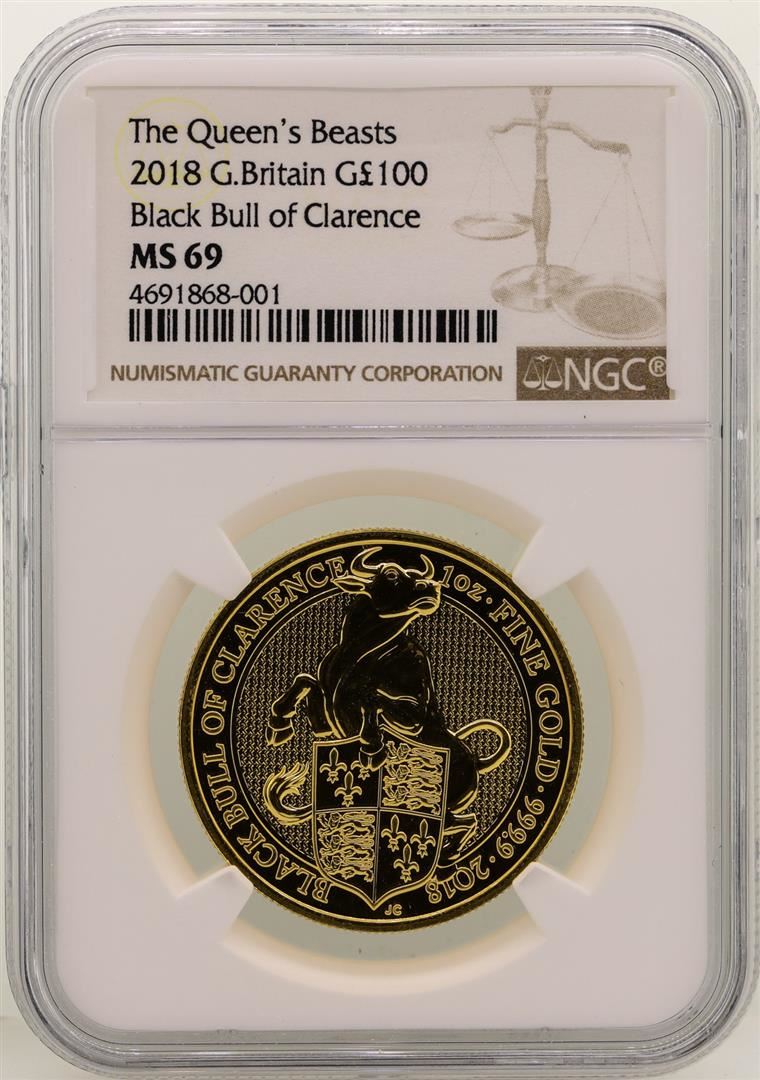 One 2018 Great Britain 100 Pounds Black Bull of Clarence Gold Coin NGC MS69. NGC Certified.