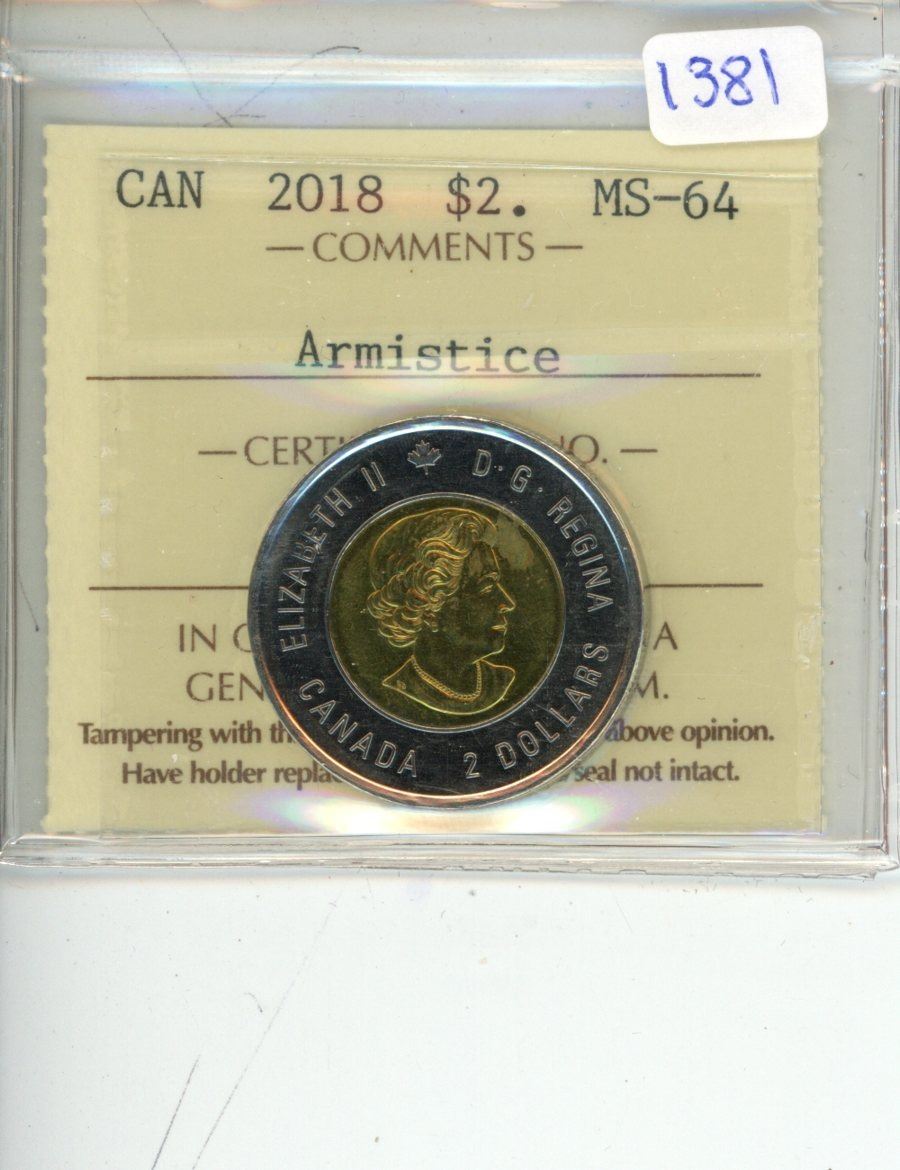 2018 ICCS graded, Canadian 2 dollar coin - MS64 Armistice; Colour