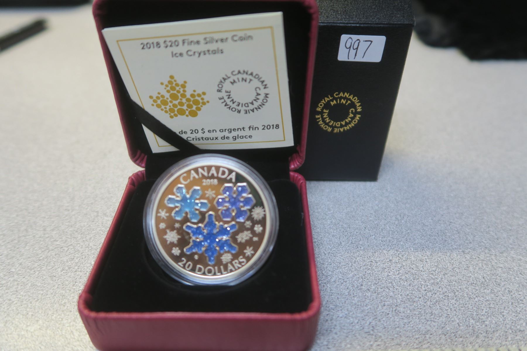 2018 Ice Crystals $20. Includes 3 blue-coloured sparkle-enamelled ice crystals that convey the beauty of winter in Canada. 99.99% pure Silver. Proof with Ultra Heavy Cameo. Housed in its original RCM case & box of issue.