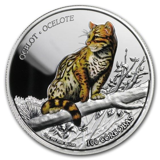 One piece 2018 Nicaragua 1 oz Silver 100 Córdobas Wildlife: Ocelot