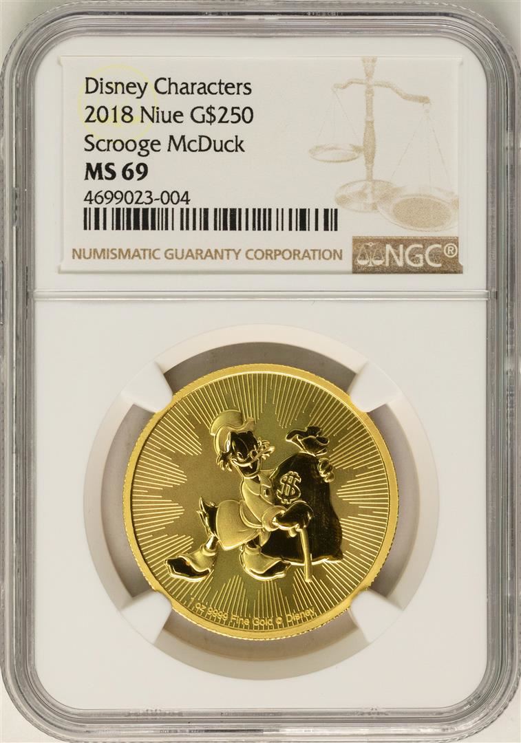 One 2018 Niue $250 Scrooge McDuck Disney Gold Coin NGC MS69. NGC Certified.