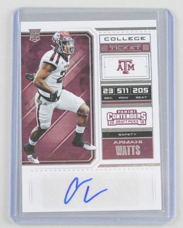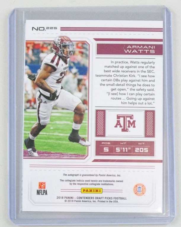 American football card. Featuring Armani Watts. Signed. No. 225. Player biography on the back.