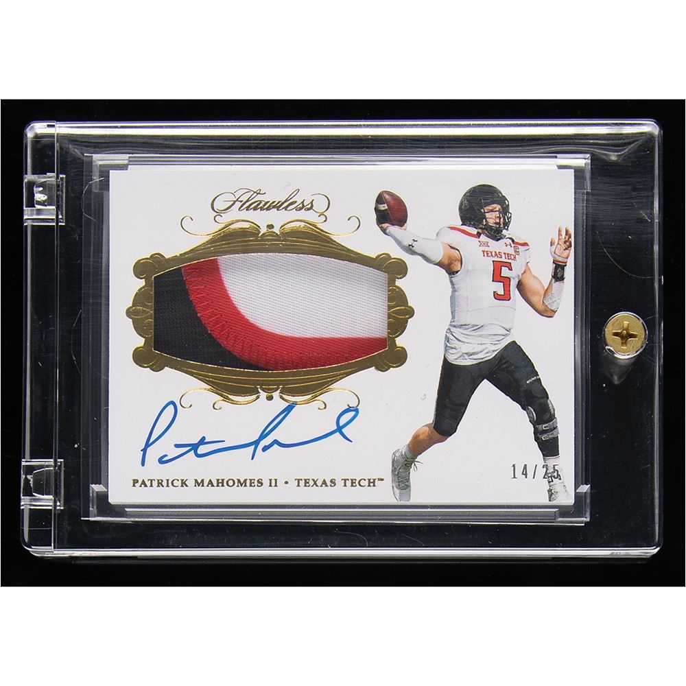 Outstanding autographed player-worn patch card of superstar quarterback Pat Mahomes, numbered 14/25, featuring a nice blue felt tip signature and a large three-color patch swatch. The card shows Mahomes during his collegiate career with the Texas Tech Red Raiders, where he refined his electric scrambling, gunslinging style. In his short career with the Kansas City Chiefs, Mahomes has already made three Pro Bowls and won Super Bowl and NFL MVP Awards.