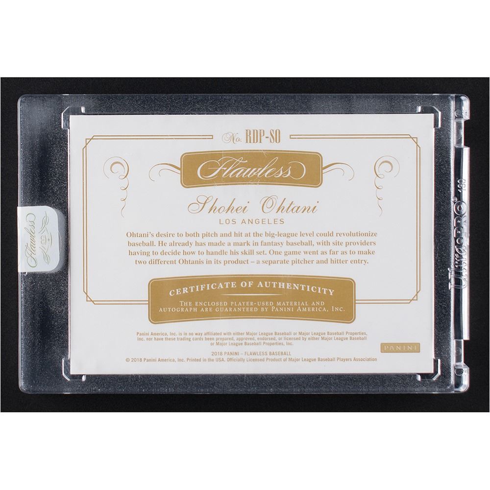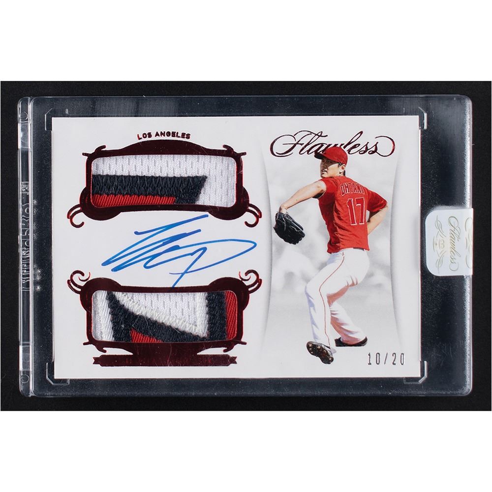 Factory sealed in its Panini Flawless holder. Stunning autographed dual patch card of Los Angeles Angels superstar Shohei Ohtani, numbered 10/20, featuring two nice multi-color player-worn patches and a choice blue felt tip signature. A spectacular card of the multi-talented ballplayer, showing him in a great pitching pose. Ohtani earned AL Rookie of the Year honors in 2018 by hitting .285 with 22 home runs, on top of recording a 4-2 record and 3.31 ERA as a starting pitcher.