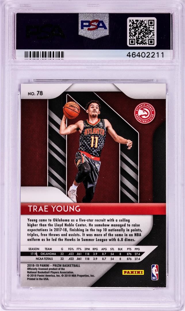One 2018 Panini Prizm Trae Young NBA Card #78 PSA Gem Mint 10. PSA Certified.