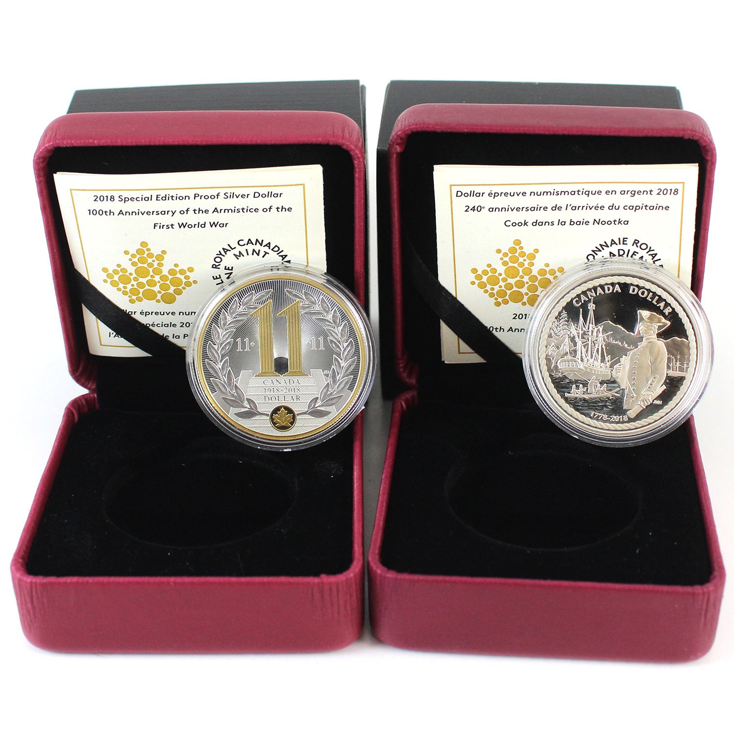INCLUDES: 240th Anniversary of Captain Cook at Nootka Sound (Toned; sticker residue on sleeve) & 100th Anniversary of the Armistice of the First World War. Both coins have scuffed capsules. 2pcs.