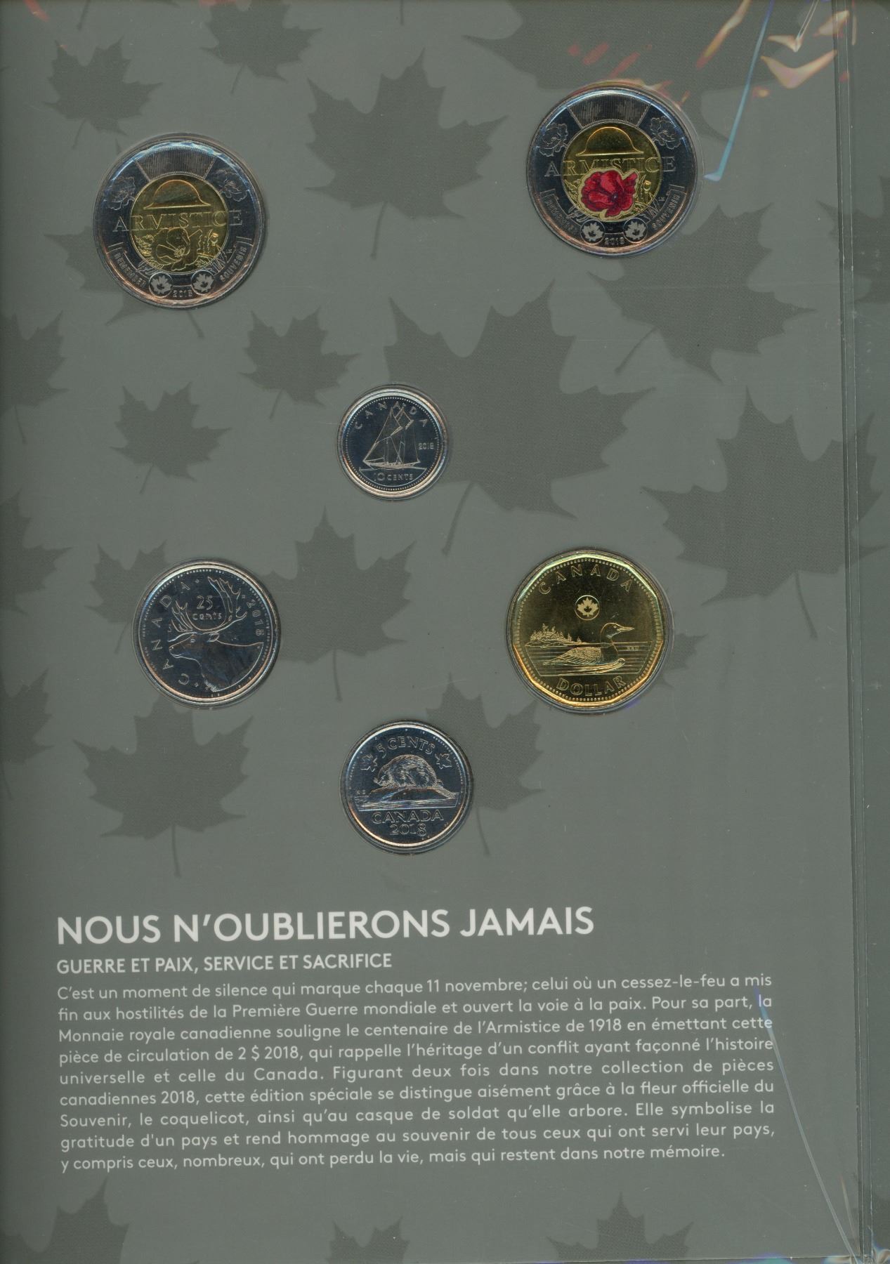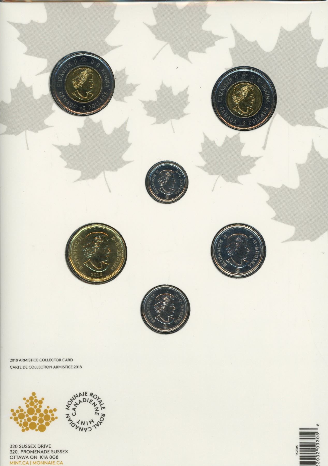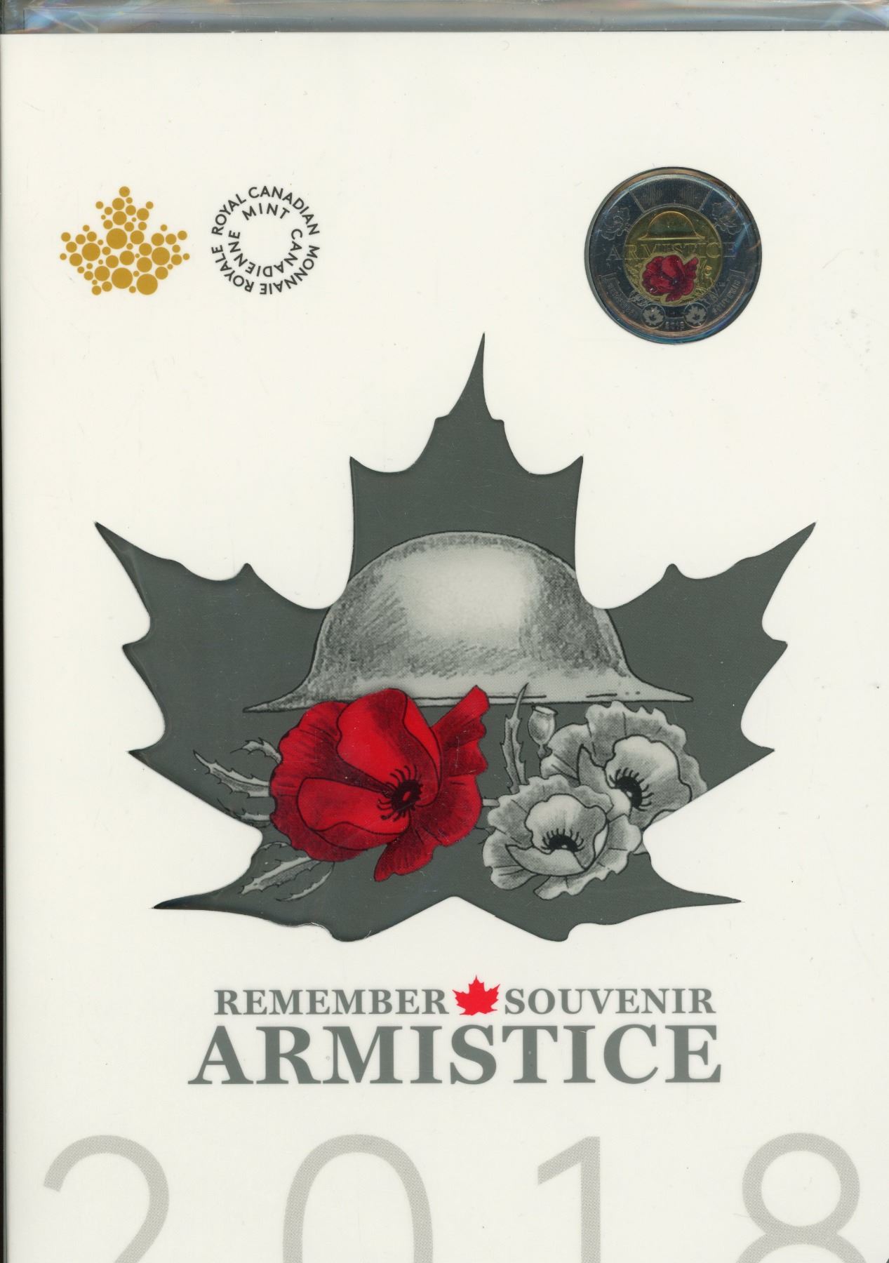 2018 Remember Armistice 6-coin set. Includes 2 Toonies: one regular, the other Colourized. Housed in its original unopened Royal Canadian Mint packaging.