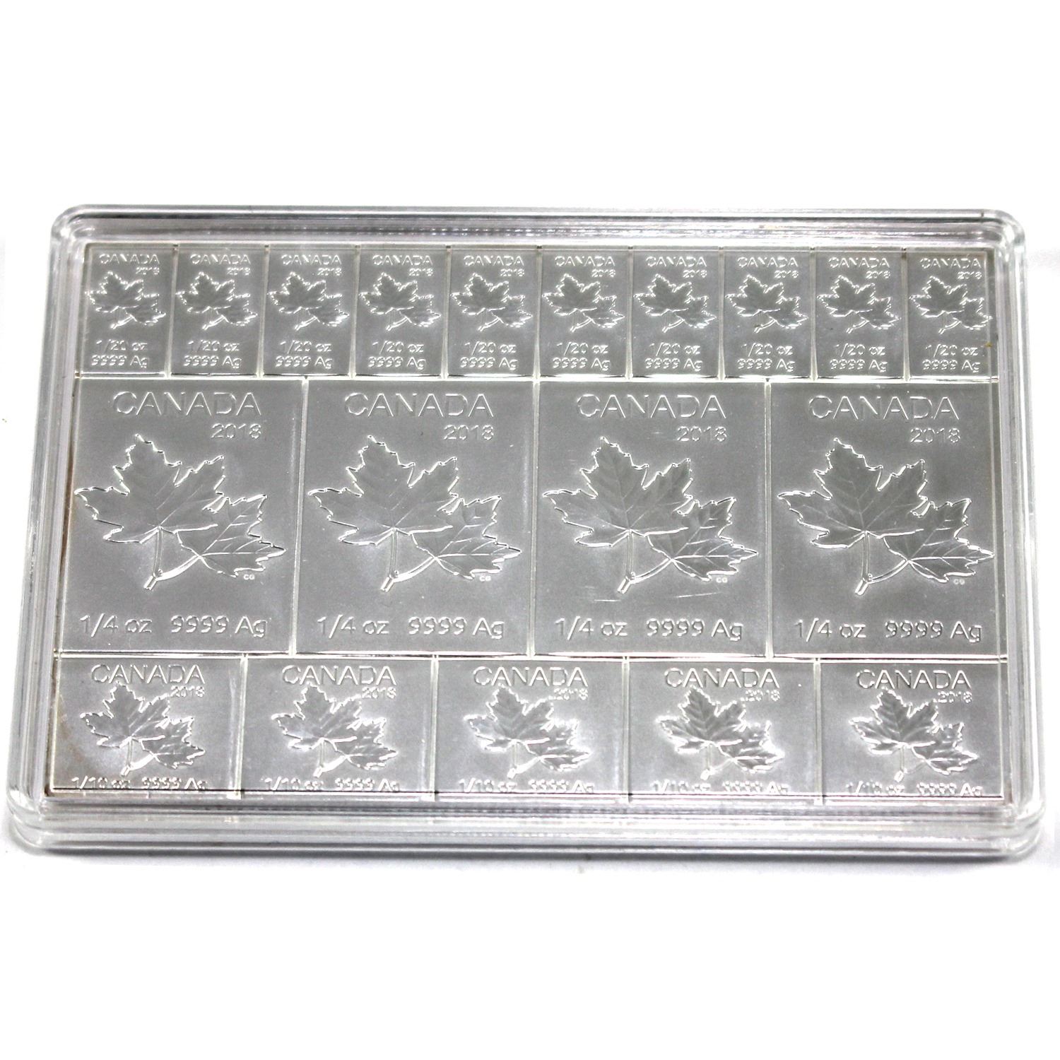 2018 Royal Canadian Mint Maple Leaf Flex 2oz. Silver Fractional Multibar (No Tax). This masterful creation’s reverse features a ‘multibar’ of three diverse, smaller bar weights, arranged in rows with the largest type in the middle; there are 10 x 1/20 oz bars, 5 x 1/10 oz bars and 4 x 1/4 oz bars included in the larger grid.