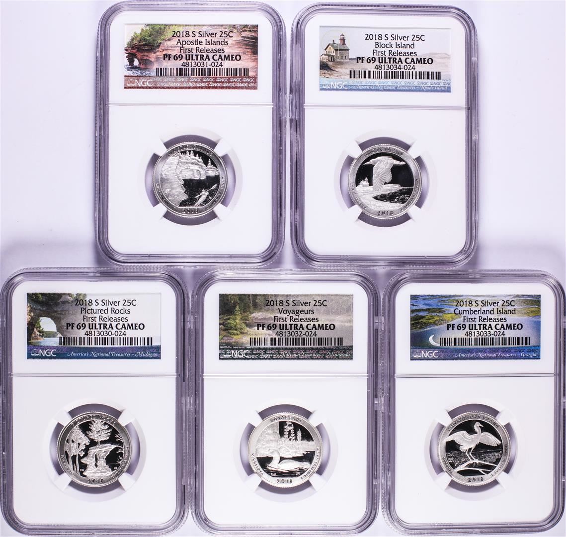 One 2018-S Silver Proof National Parks Quarter (5) Coin Set NGC PF69 Ultra Cameo.
