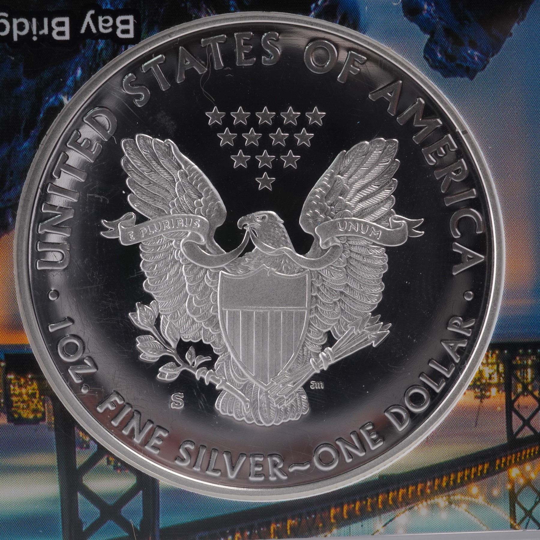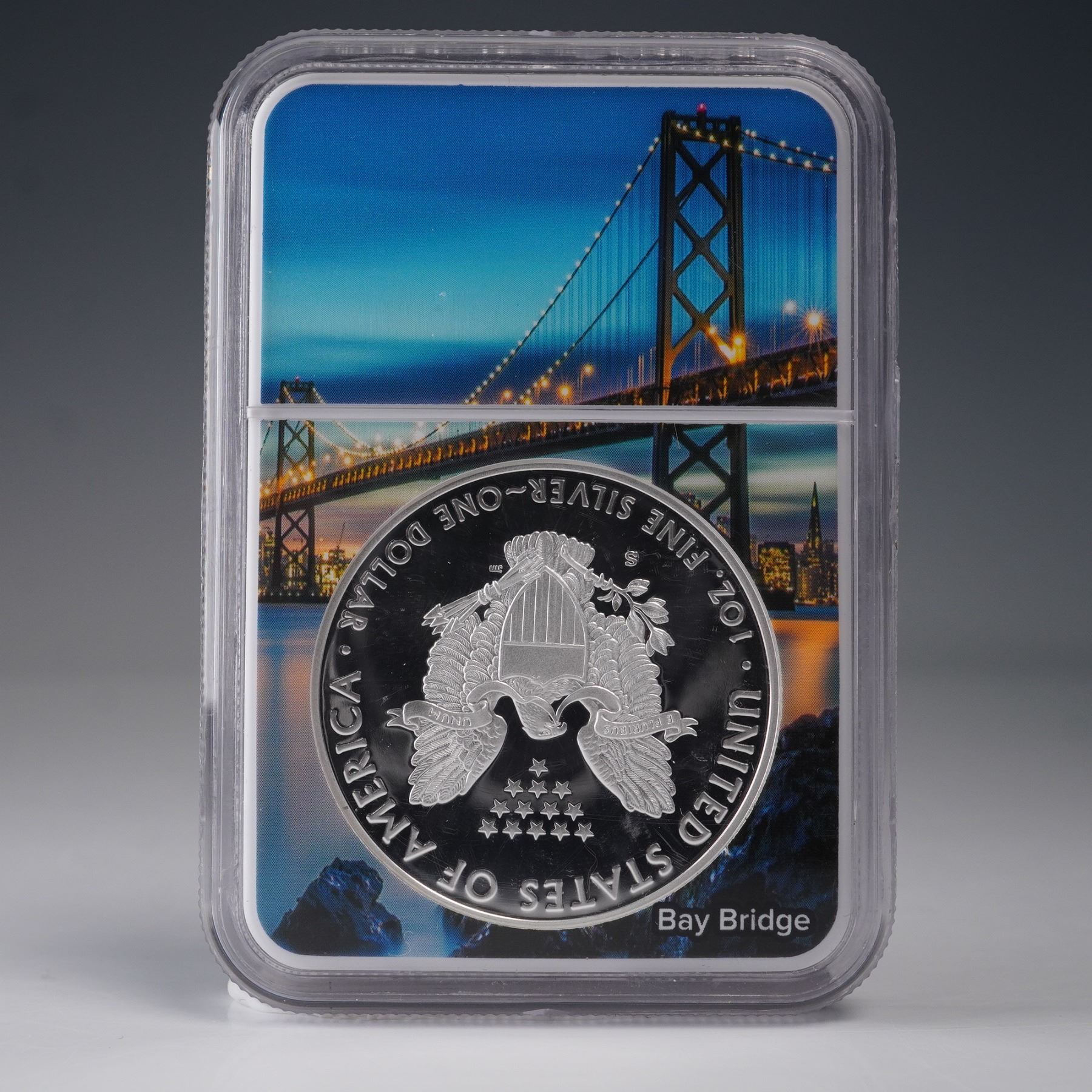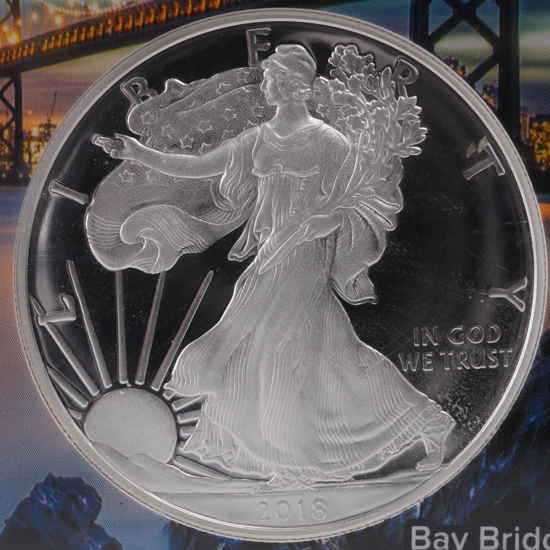 2018 American Silver Eagle one-dollar proof coin, minted at the San Francisco Mint and certified by NGC as PF70 Ultra Cameo. This coin is designated "First Day of Issue." The obverse features Adolph A. Weinman's classic Walking Liberty design, originally used on the half dollar from 1916 to 1947. Liberty is shown in full stride, draped in the American flag, with her right hand extended and branches of laurel and oak in her left. The sun rises behind her, symbolizing hope and renewal, with the word "LIBERTY" arching above and the phrase "IN GOD WE TRUST" to the lower right, dated 2018 along the bottom rim. The reverse, designed by John Mercanti, presents a heraldic eagle with a shield on its chest, an olive branch in the right talon, and arrows in the left. A ribbon in the eagle's beak reads "E PLURIBUS UNUM," and a cluster of thirteen five-pointed stars appears above the eagle's head, representing the original thirteen colonies. The text reads "UNITED STATES OF AMERICA-1 OZ. FINE SILVER-ONE DOLLAR." An "S" mintmark below the eagle denotes production at the San Francisco Mint. This coin is encapsulated and presented with a Bay Bridge-themed label, indicating its San Francisco origin. Graded PF70 Ultra Cameo by NGC, this proof coin is struck with mirrored fields and frosted devices, representing the highest numeric grade available. Slab: 2.25"L x 0.5"W x 3.25"H. Coin diameter: 39mm.