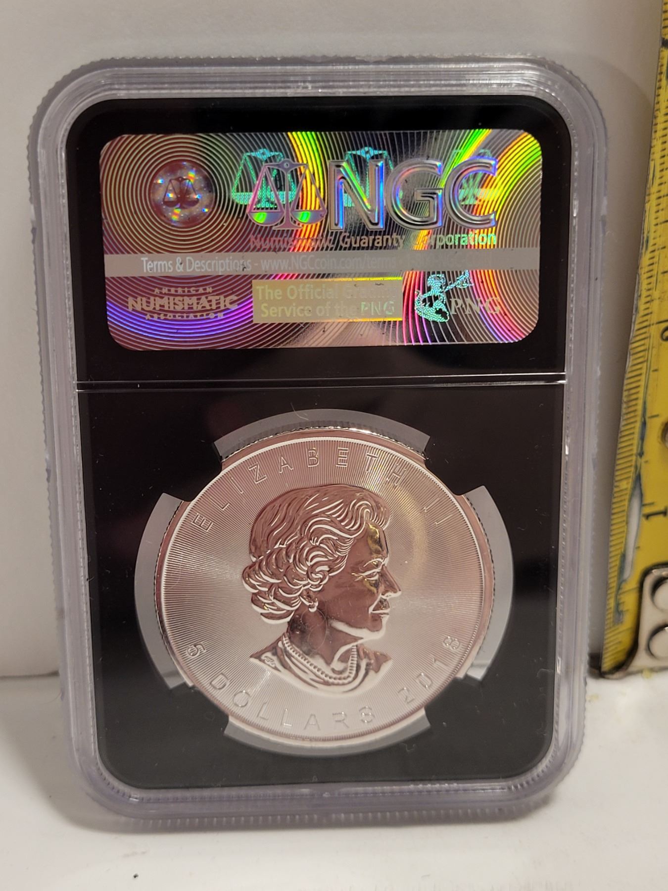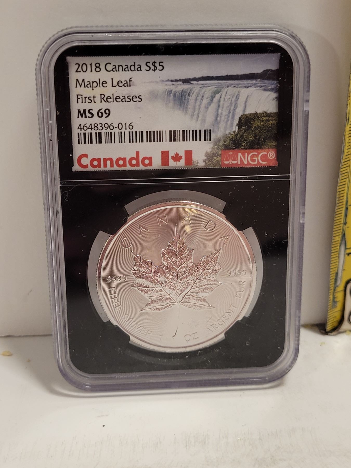 2018 SILVER $5 MAPLE LEAF PRIVY NCG MS69. FIRST RELEASES. GRADED IN A BLACK HOLDER