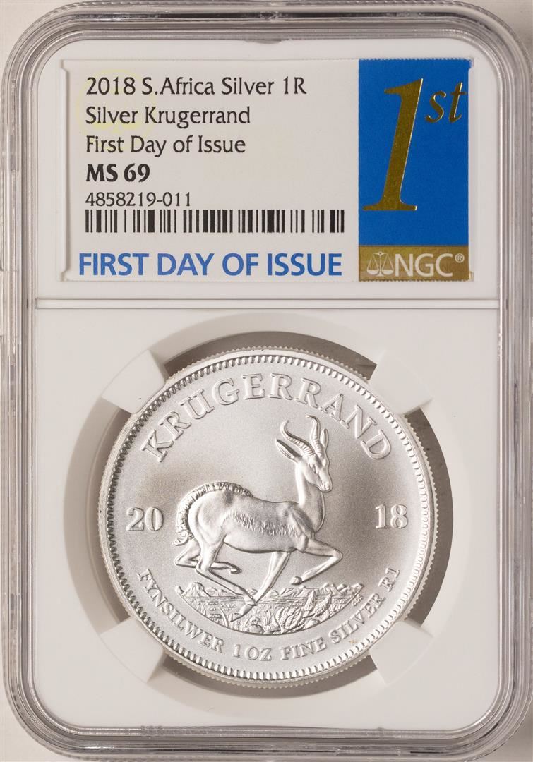 One 2018 South Africa Krugerrand Silver Coin NGC MS69 First Day of Issue. NGC Certified.