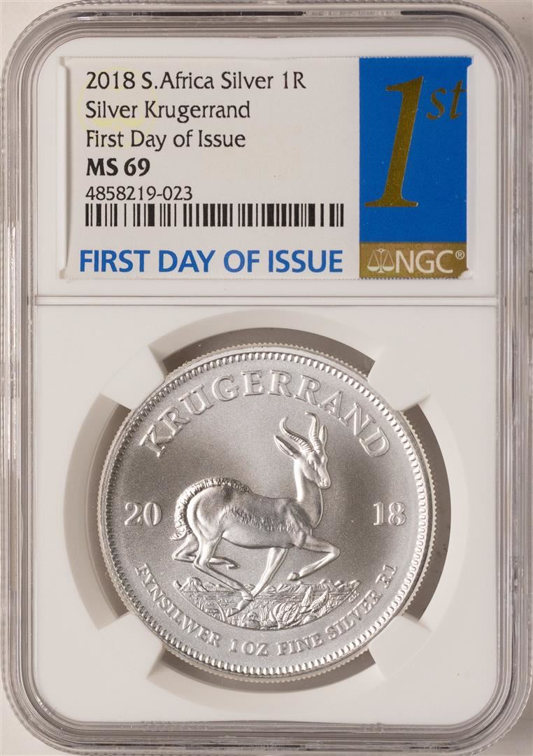 One 2018 South Africa Krugerrand Silver Coin NGC MS69 First Day of Issue. NGC Certified.