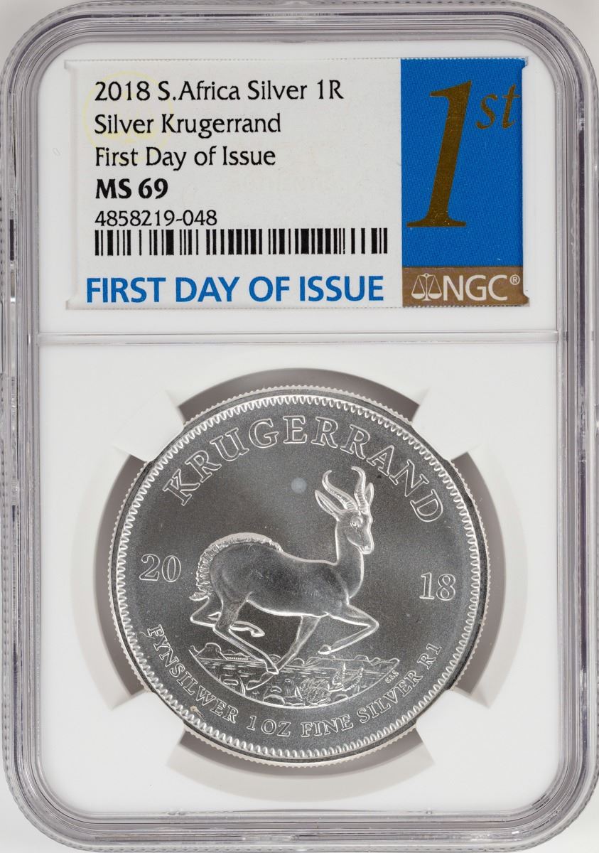 One 2018 South Africa Krugerrand Silver Coin NGC MS69 First Day of Issue.