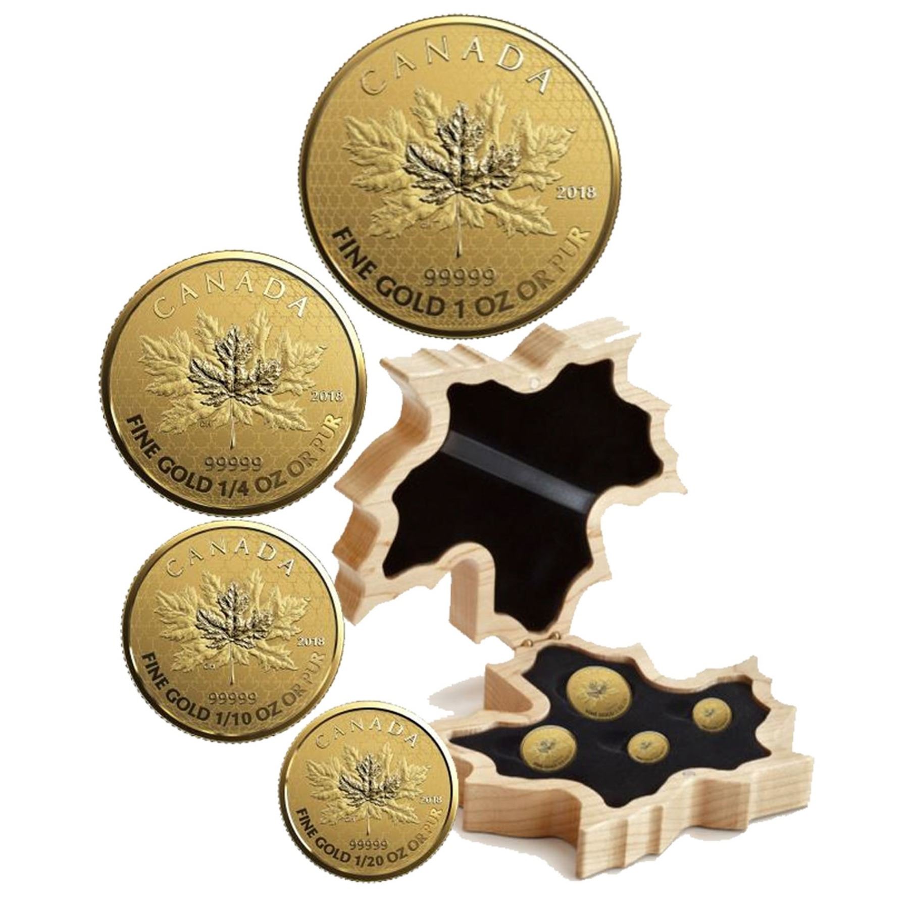 2018 The Maple Leaf .99999 Fine Gold Fractional 4-coin Set. Features 1oz, 1/4oz, 1/10oz & 1/20oz denominations. First fractional gold set minted from .99999 fine gold! Mintage of only 600! (1.39ozt) (TAX Exempt)