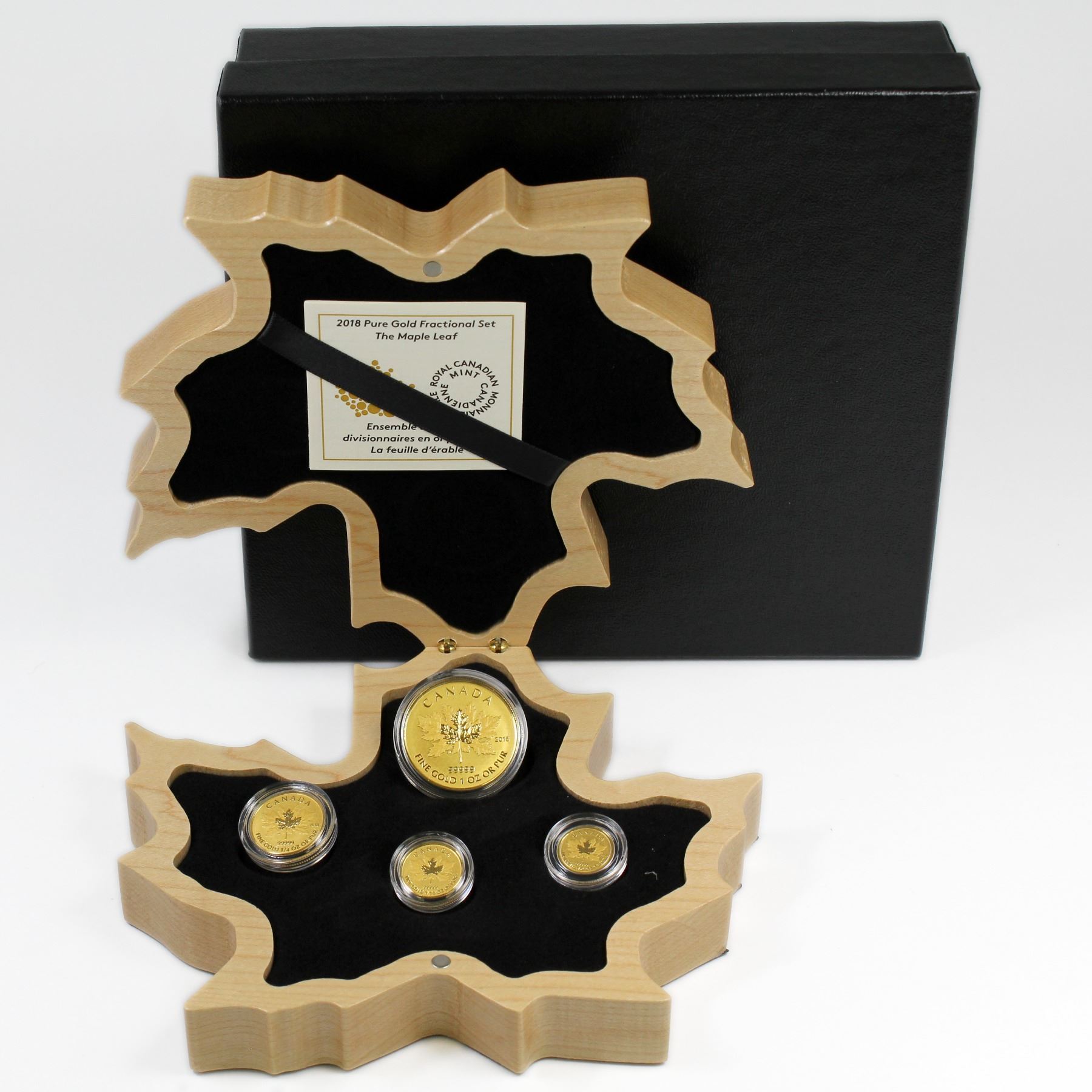 2018 The Maple Leaf Fractional 4-coin Fine Gold Set in Beautiful Deluxe Display Case. You will receive 1oz, 1/4oz, 1/10oz & 1/20oz gold coins. Low COA #041 out of only 600 minted!!! (TAX Exempt)