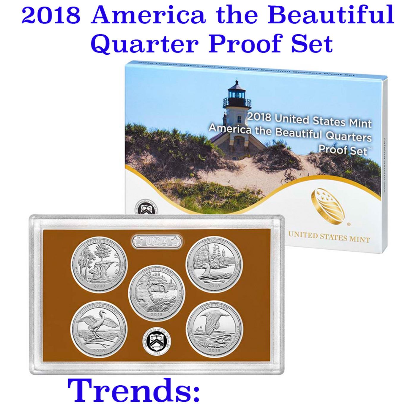 2018 United States America The Beautiful Proof Quarters set 5 coins. This set consists of five America the Beautiful Quarters® Program coins with proof finishes honoring Pictured Rocks National Lakeshore in Michigan; Apostle Islands National Lakeshore in Wisconsin; Voyageurs National Park in Minnesota; Cumberland Island National Seashore in Georgia; and Block Island National Wildlife Refuge in Rhode Island.
