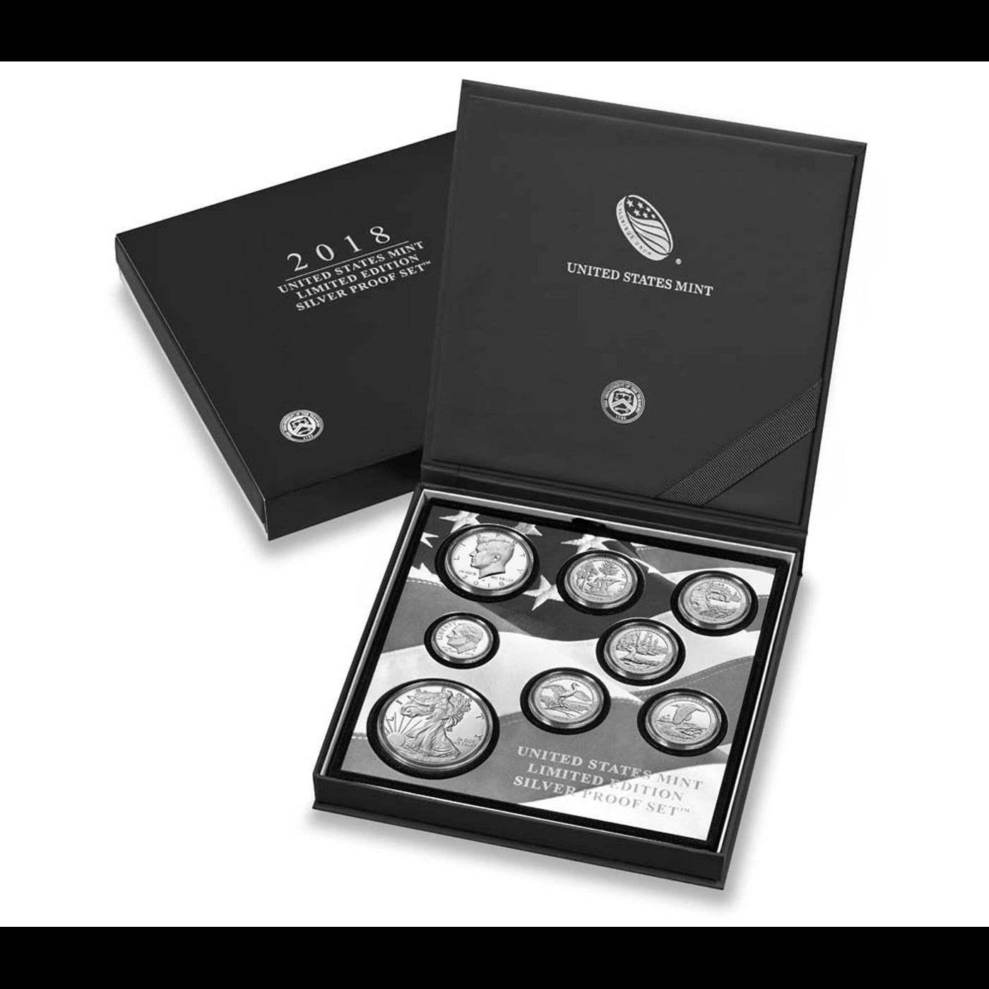 2018 United States Mint Limited Edition Silver Proof Set 8 coins. Tlhe 2018 Limted Edition Silver Proof Set contains 8 coins all ..999 silver. The set includes the 2018 Silver Eagle, the 2018 Kennedy Half Dollar, the 2018 Roosevelt dime and the 5 America the Beautiful Quarters for the year, Pictured Rocks, LAjpostle Islands, Voyageurs, Cumberland Island, and Block Island. All coins are deep cameo proof versions on the coins.