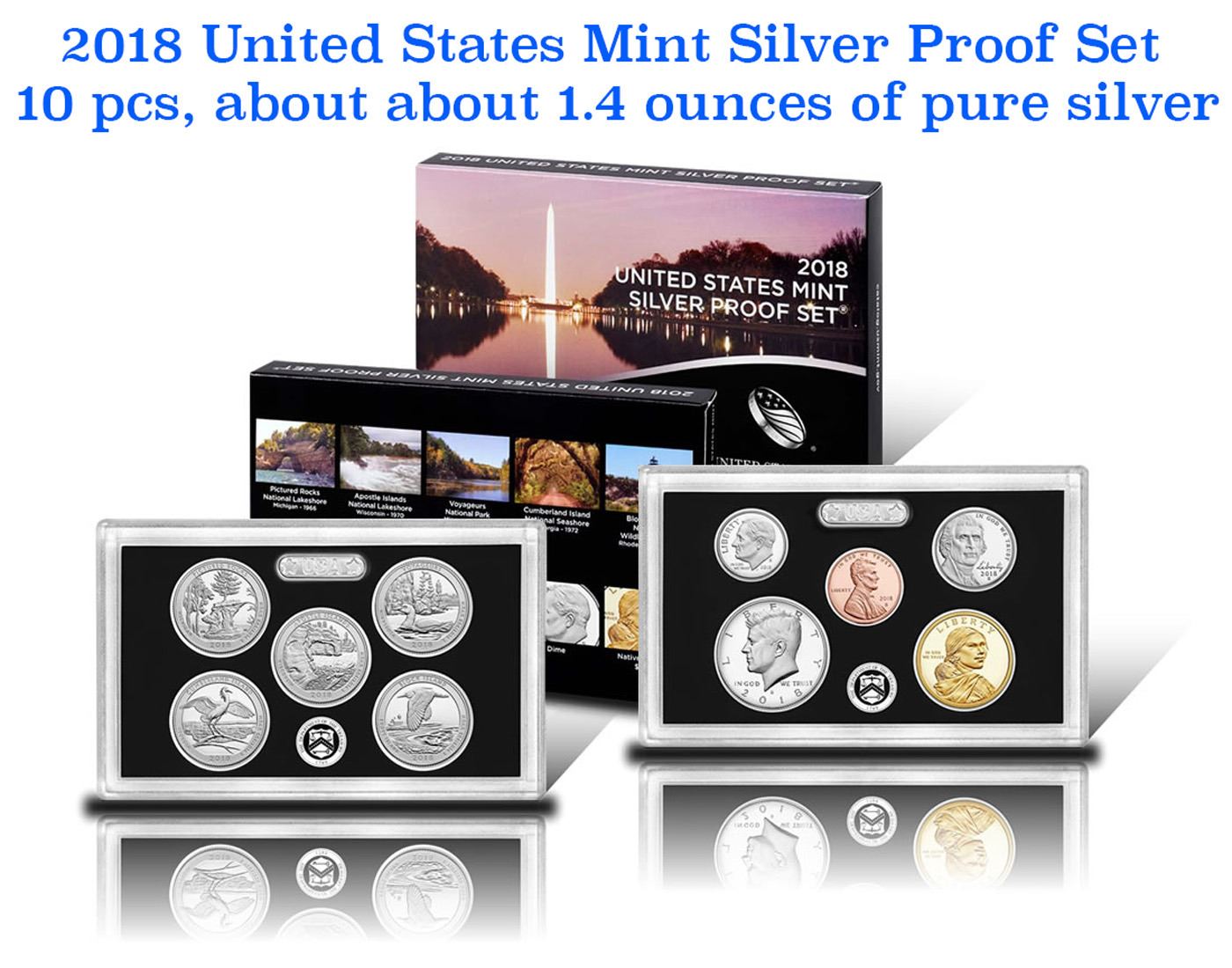 2018 United States Mint Silver Proof Set; 10 pcs, about about 1.4 ounces of pure silver.