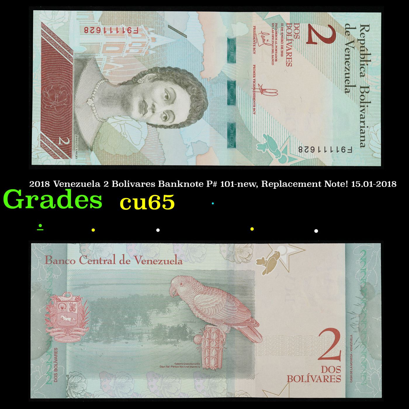 2018 Venezuela 2 Bolivares Banknote P# 101-new, Replacement Note! 15.01-2018 Grades Gem CU