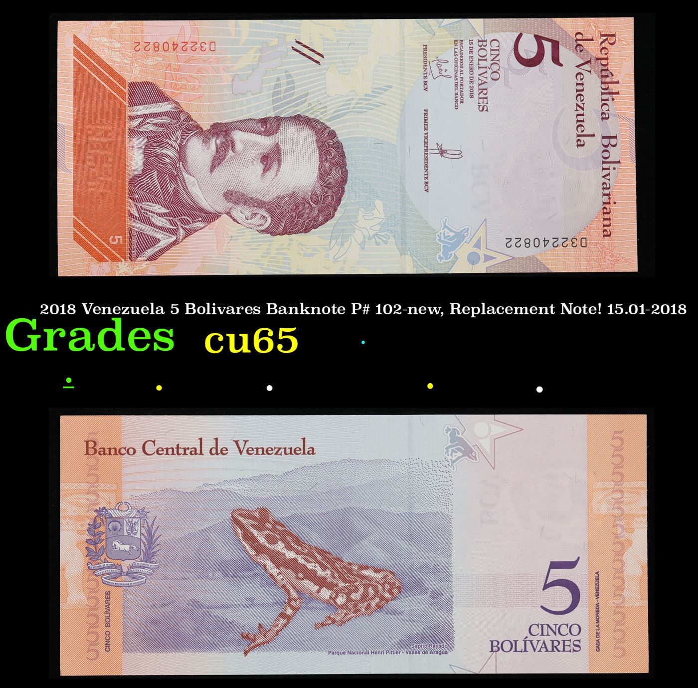 2018 Venezuela 5 Bolivares Banknote P# 102-new, Replacement Note! 15.01-2018 Grades Gem CU.