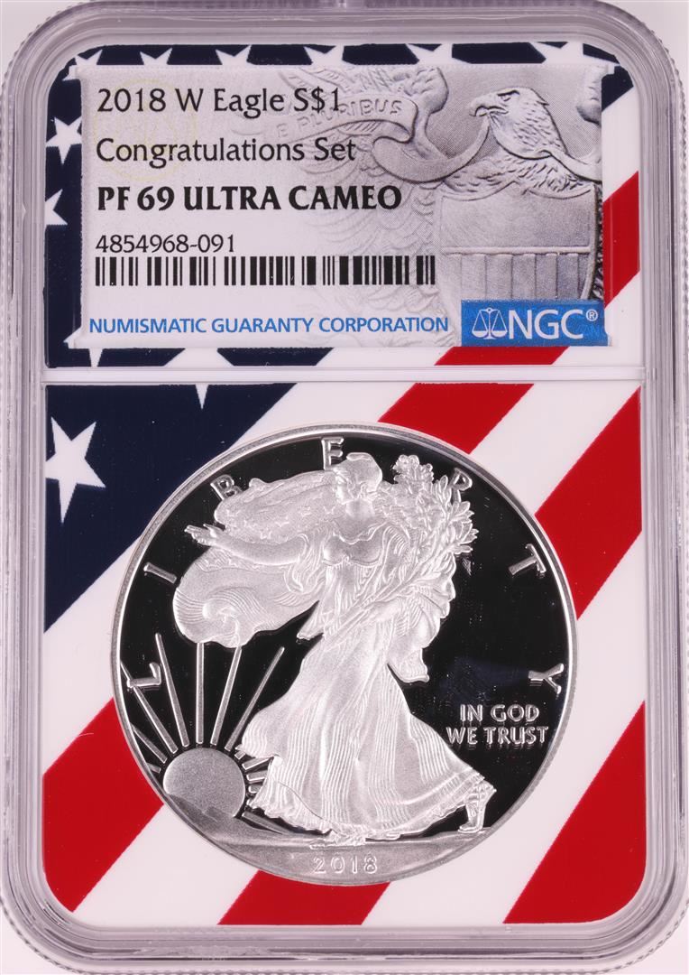 2018-W $1 Proof American Silver Eagle Coin NGC PF69 Ultra Cameo Congratulations Flag