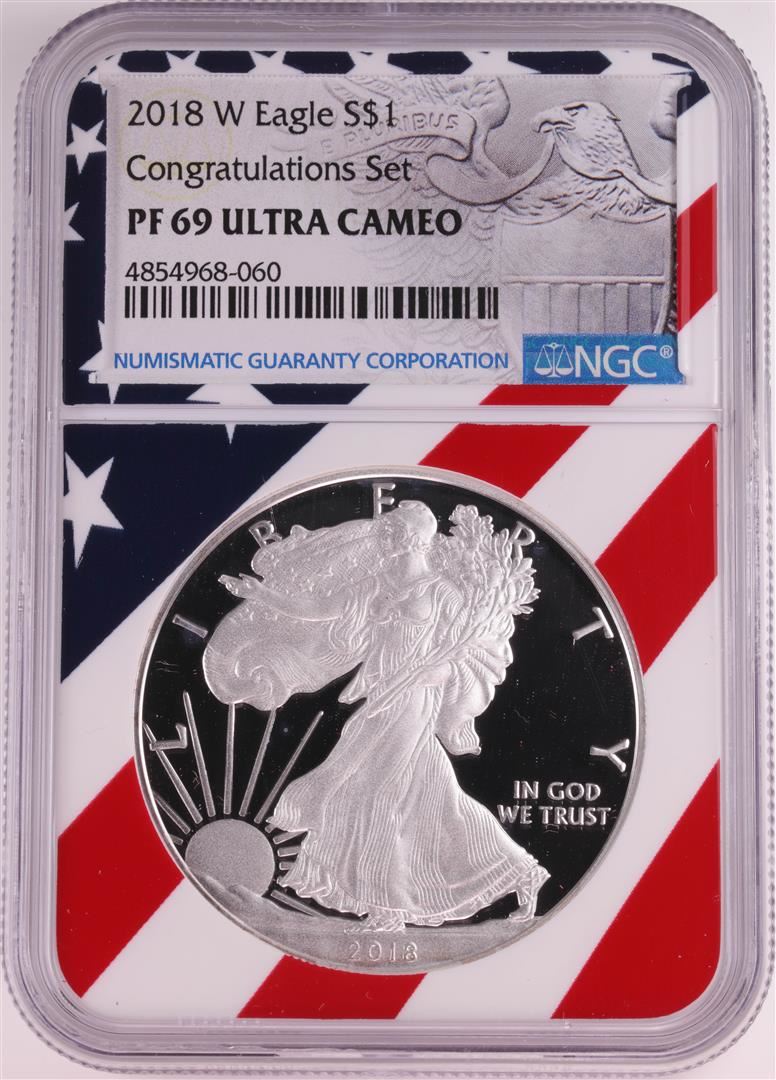 2018-W $1 Proof American Silver Eagle Coin NGC PF69 Ultra Cameo Congratulations Flag